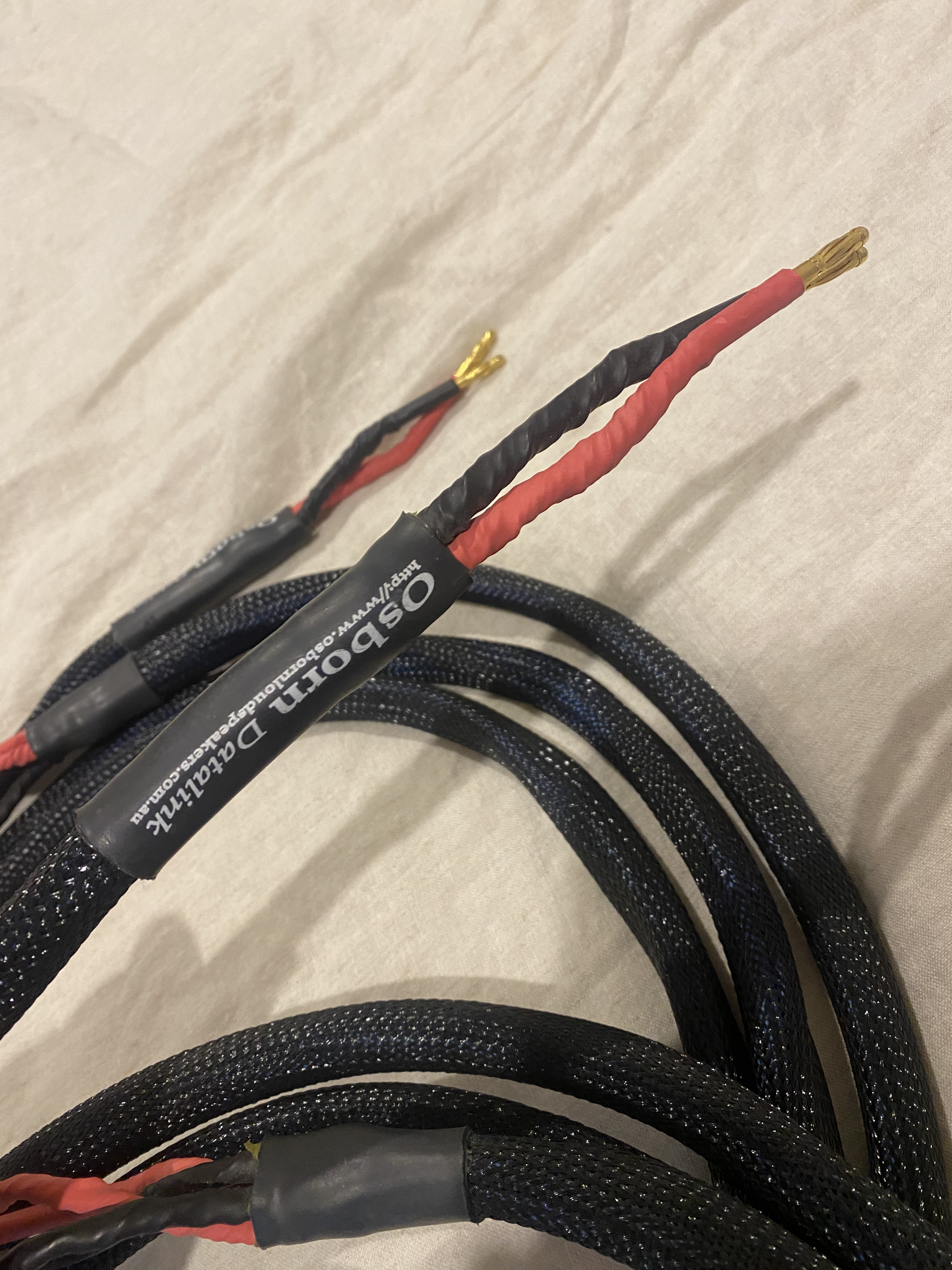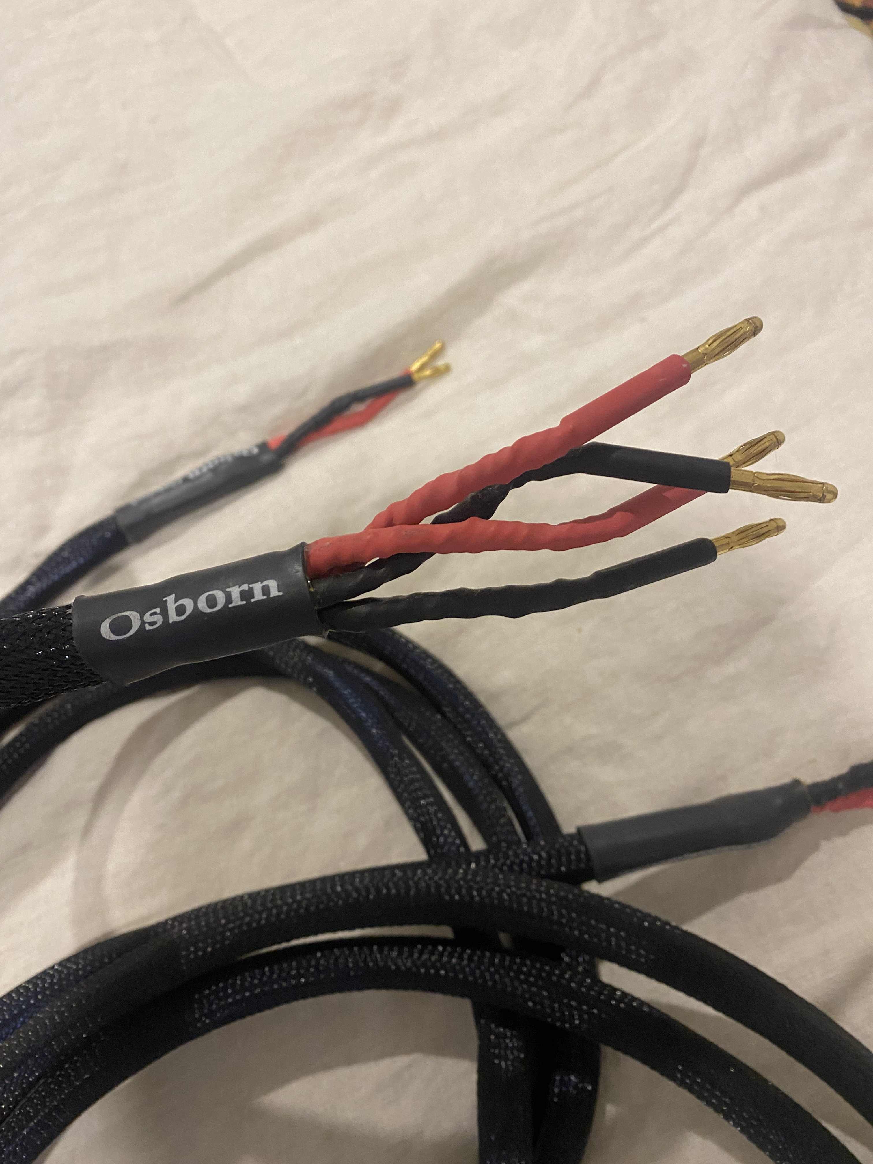The cable normally comes internally bi-wired, with two plugs at the amplifier end, and four plugs at the speaker ends. This is especially effective as the configuration and internal twist cancels the magnetic fields generated within the wire. It is also available with spades, or as a combination of spades one end and banana plugs at the other. It is also available as a normal stereo pair with two plugs, or spades at each end. The banana plugs were designed for laboratory measuring equipment are are extremely high quality.