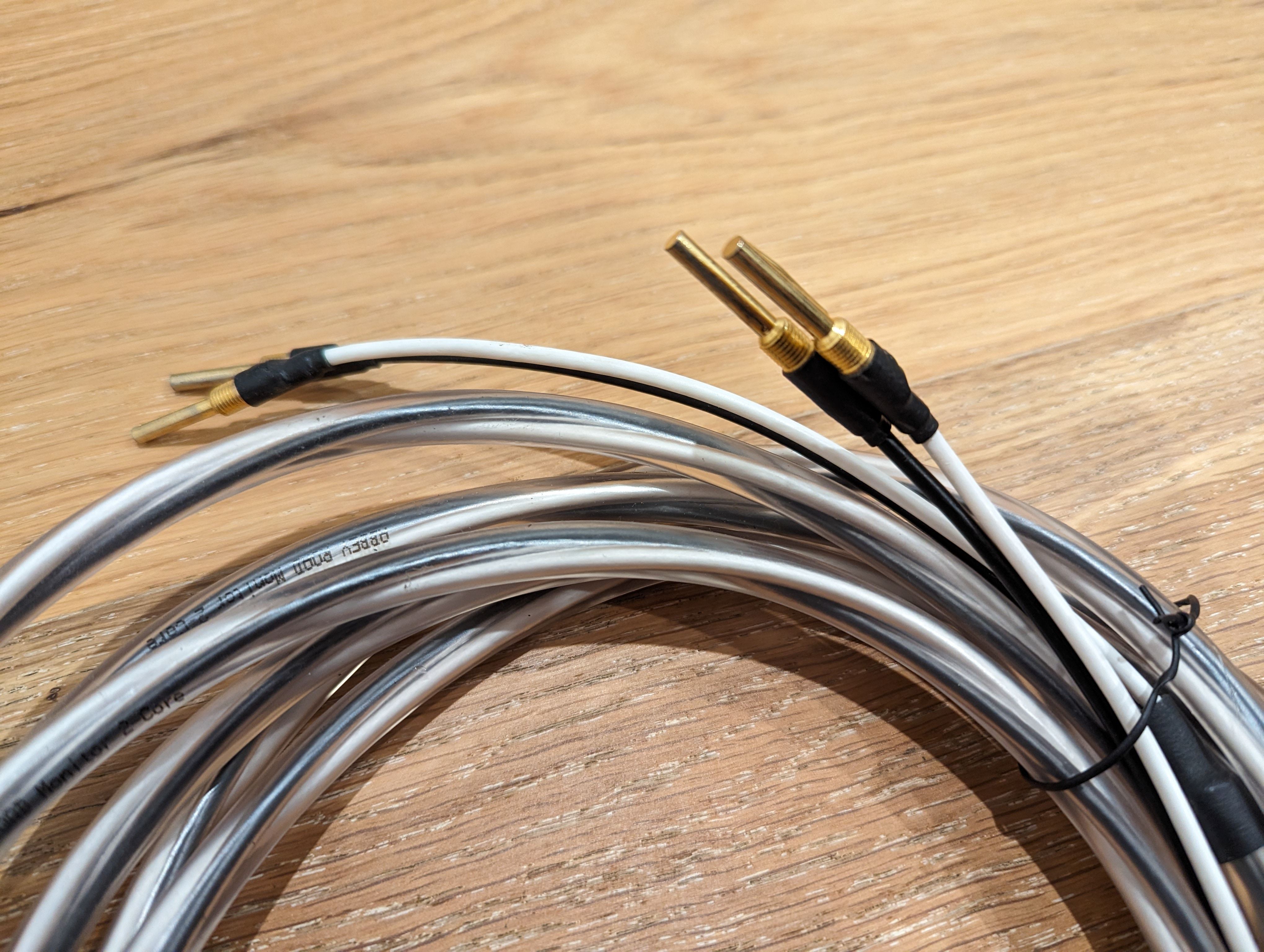 These are very neutral and transparent speaker cables. One end is terminated with banana plugs and about 2m in length.