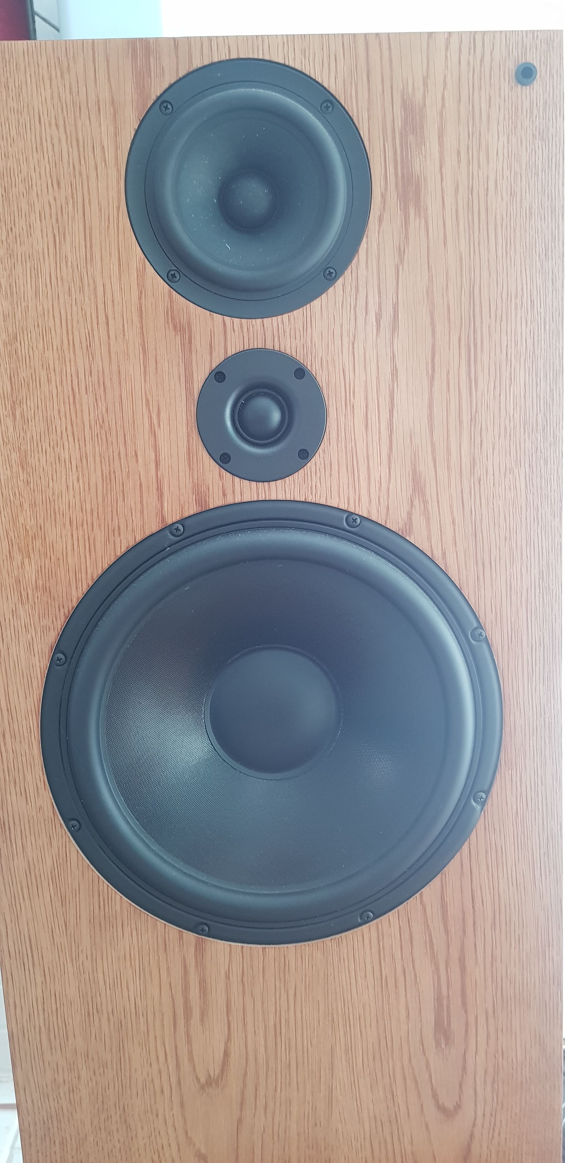 12" drivers with upgraded NRX papyrus mid cone. veneer is light oak.