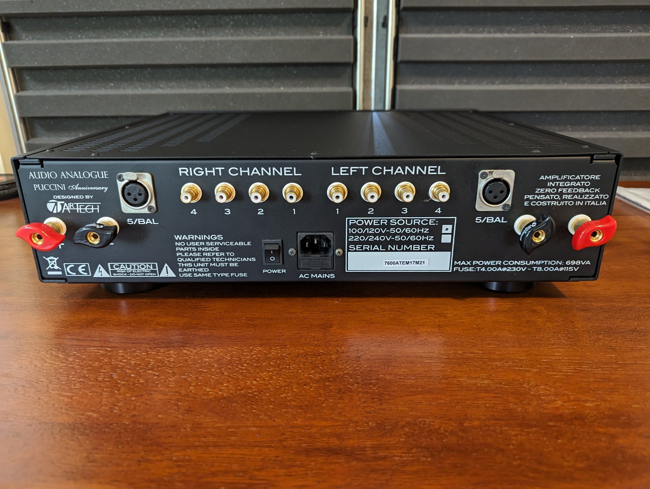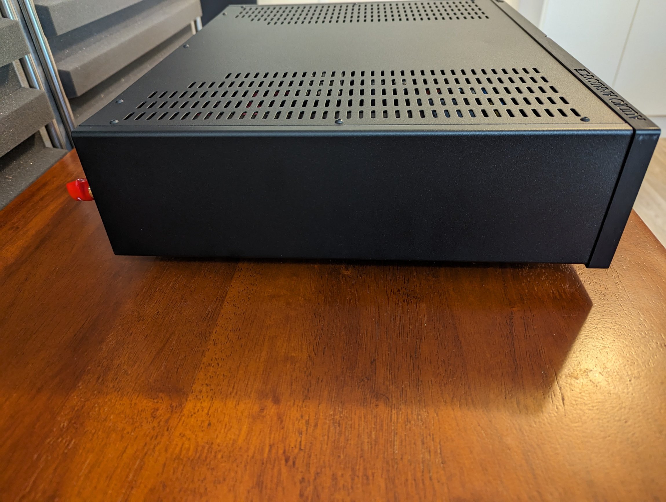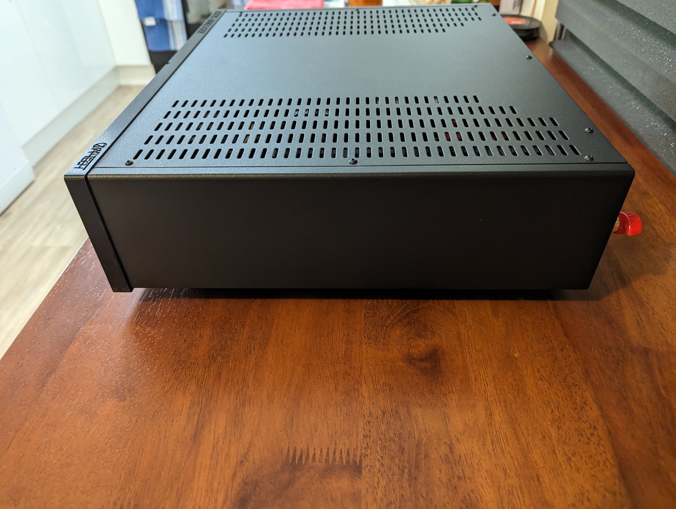 I used the Puccini to run the "Extreme Bass Test" in my lounge room in order to check the positioning of my speakers (when I changed from one set of speakers to the other and wasn't sure if the same speaker position would work for both). Initially I had run the test with a different amp and found that it did not provide as much bass as I needed for the test, so in went the Puccini. Once I had the speaker position sorted I ran the test again, just for the joy the results brought me. Then, just because sometimes these things need to happen, I ran the test again with a 350wpc MOSFET monster of an amp. It did give me much more bass, but it wasn't as tightly controlled or articulate as it was with the Puccini. This really isn't what the Puccini was designed for guys, it is a very musical amp and was designed as such, it's just that it has such a good power supply it gives very strong and well controlled bass and that is something that makes an impression on the listener.