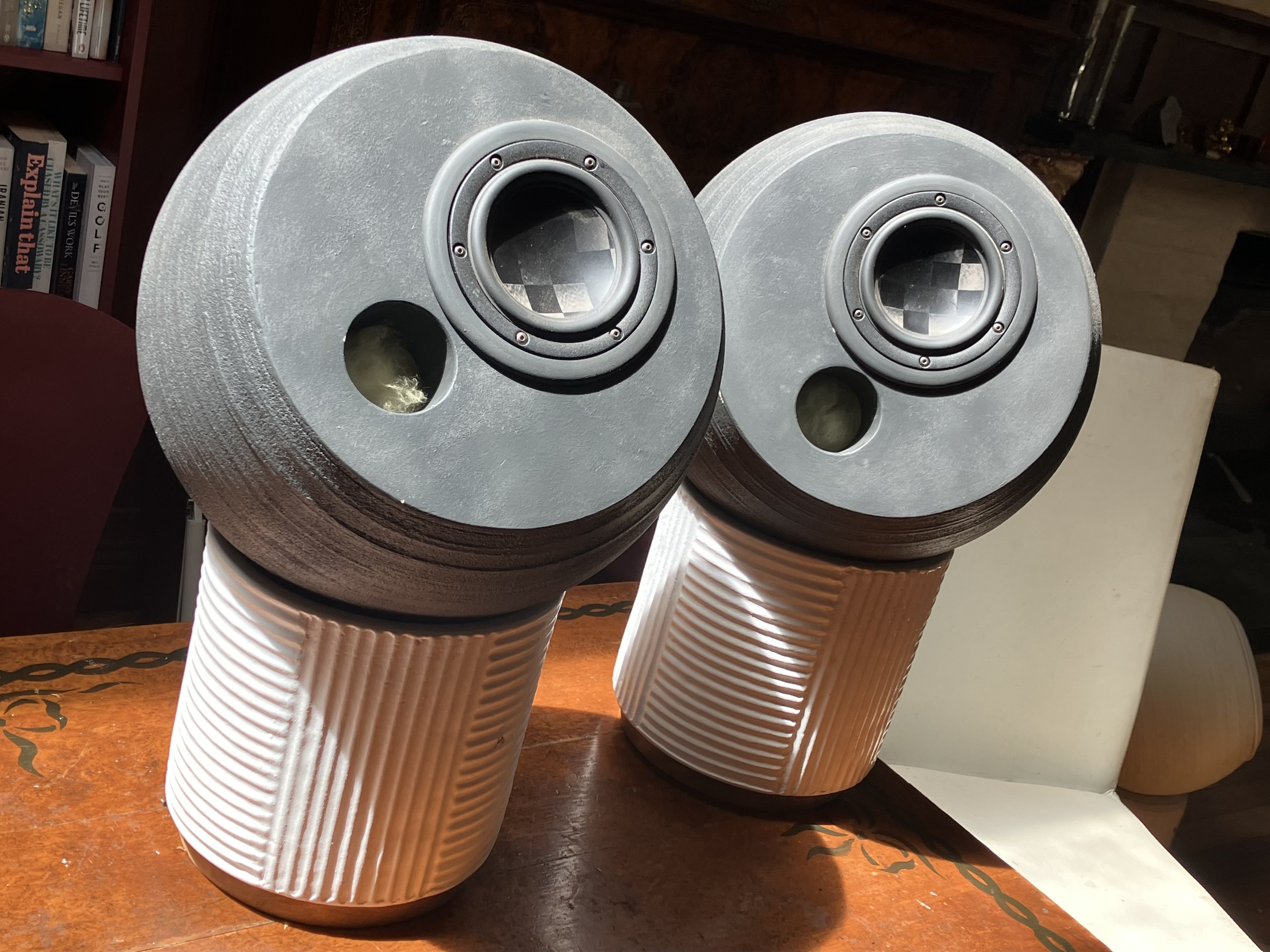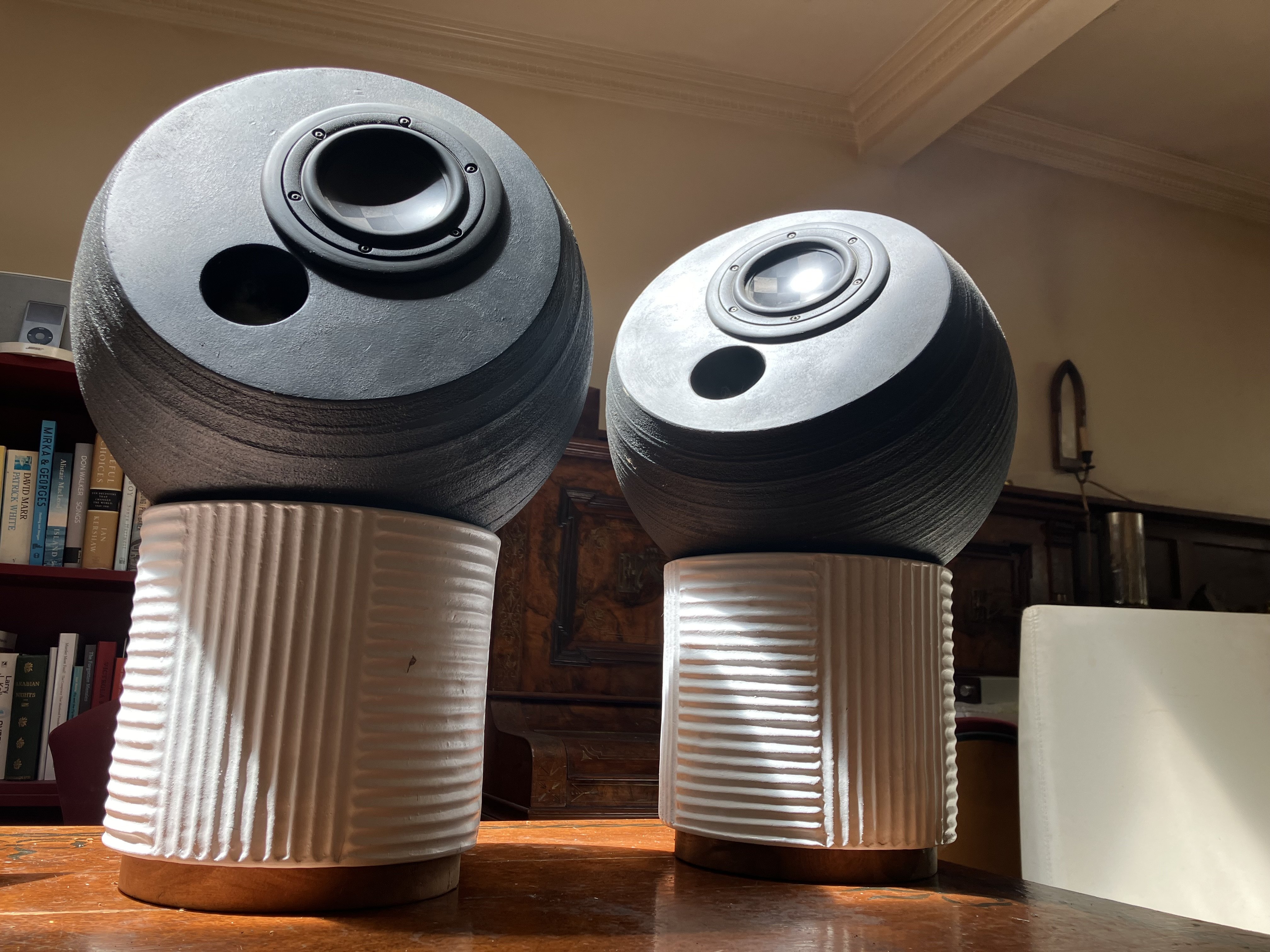 These Audiospheres are made of concrete. That means no resonance from the enclosure. The curved shape minimises diffraction. They sit freely in their tubs – so they are infinitely adjustable to your listening position. They are heavy, but an easy one-person lift.