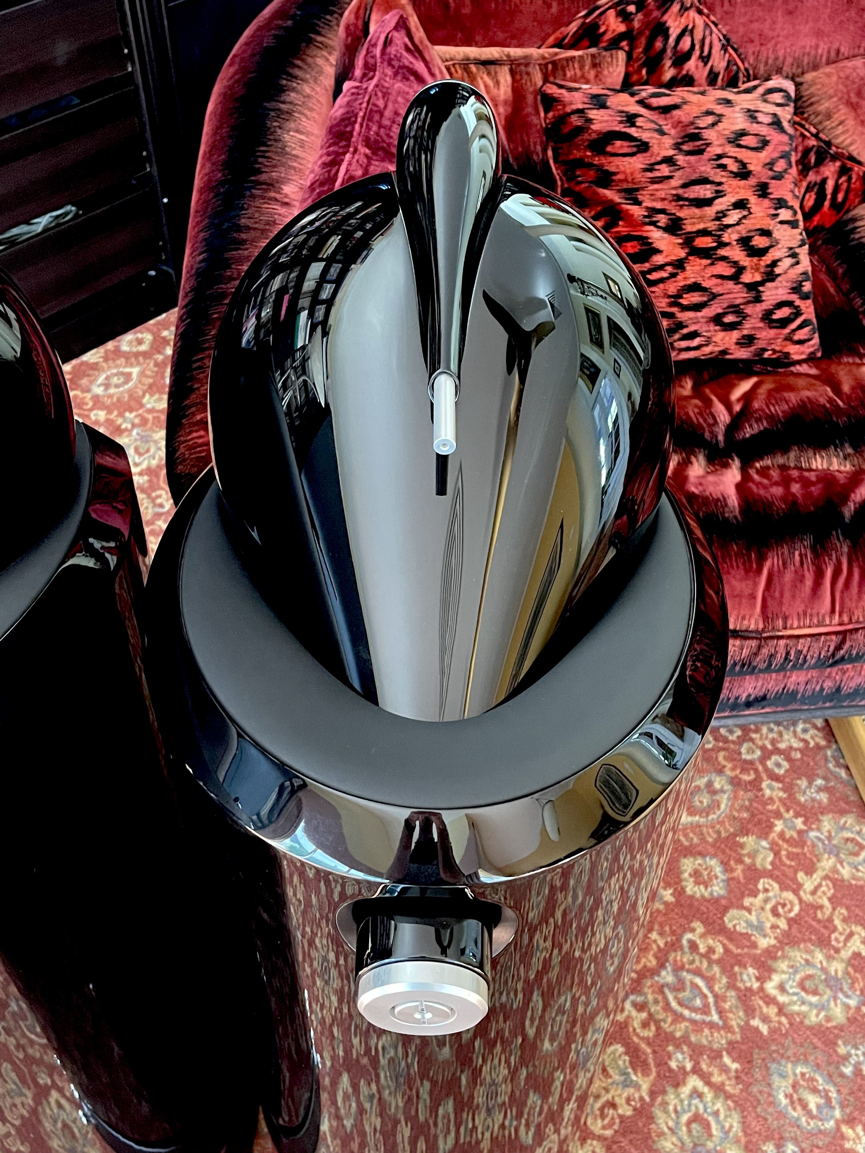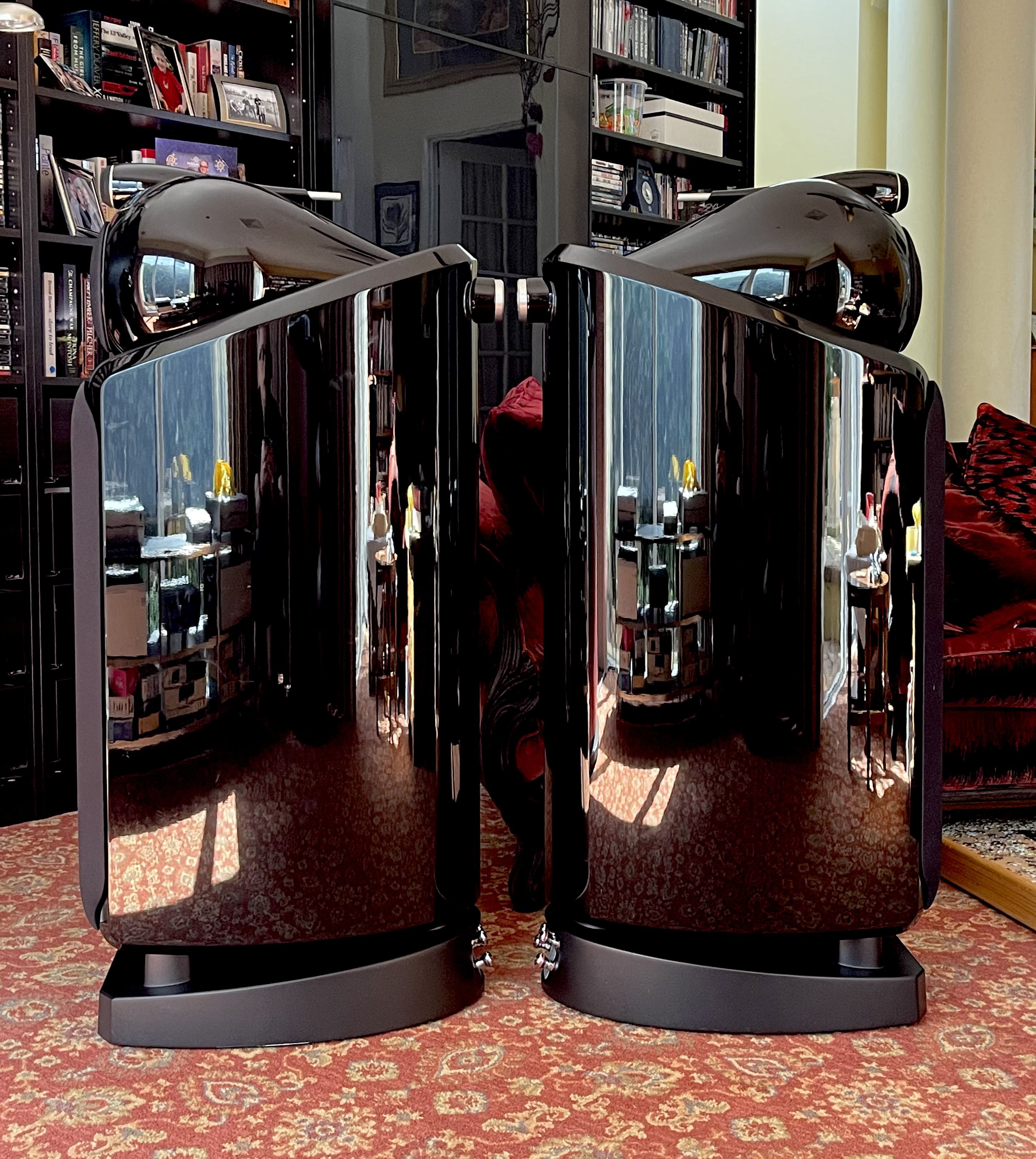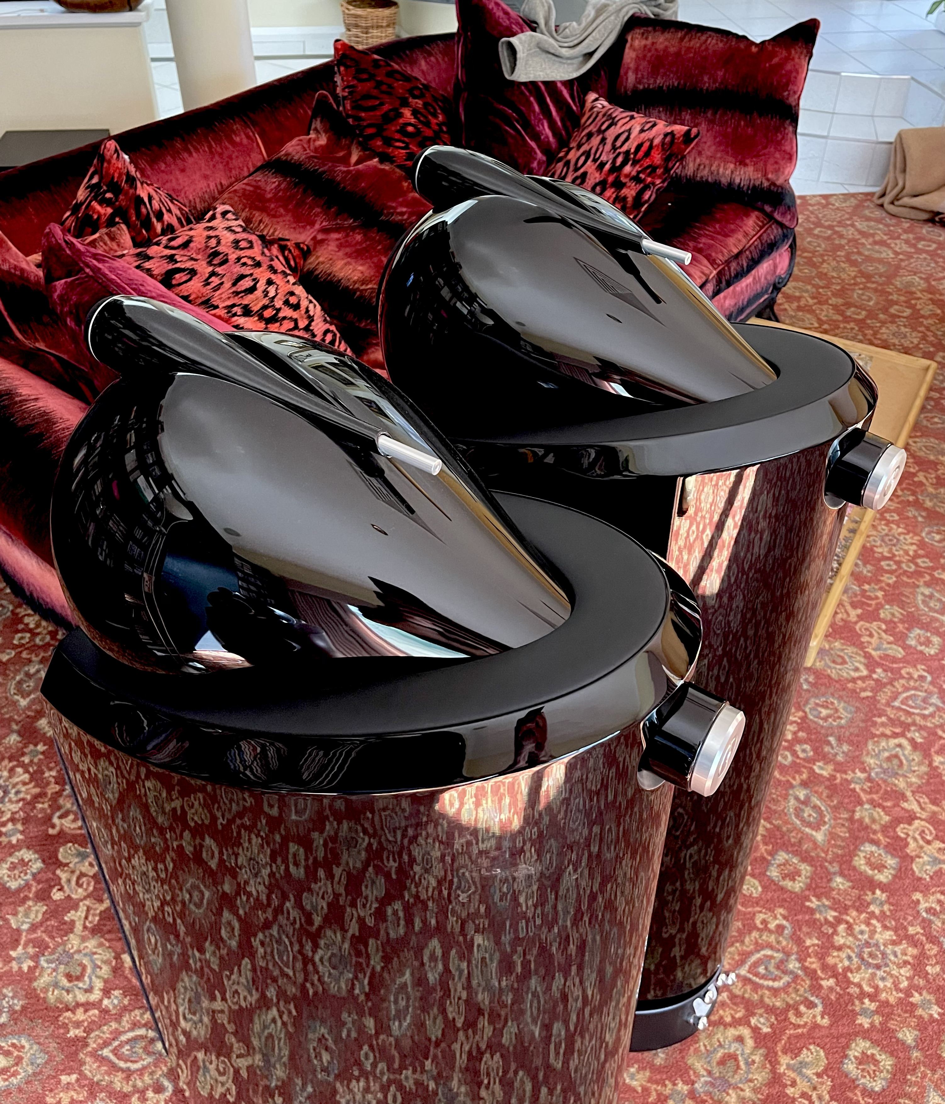 They are in excellent condition which I hope comes through on the photos. The piano black, high gloss makes taking photos challenging! They come with all accessories. They are on the castors at the moment which makes for easy positioning and the epic dual spikes/rubber feet are included, along with main grills and the mid range circular ones.