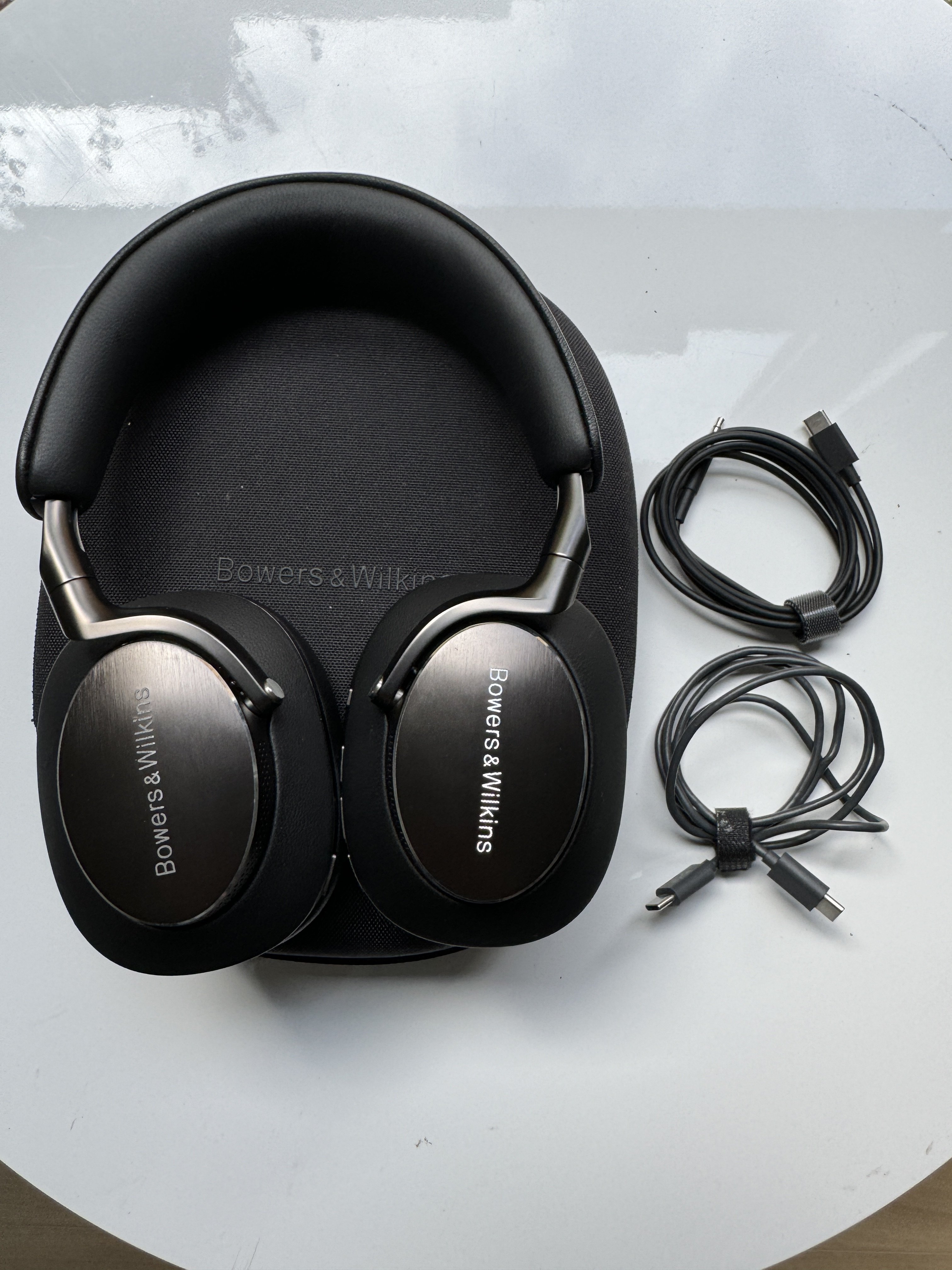 Bowers and Wilkins PX8 Bluetooth headphones. Bought end of December 2022 and only used occasionally inside. In excellent conditons and comes with carry case, UBS C to C and USB C to 3.5mm cables but no box. Great sound and noise cancellation. No longer use these as working from home more and use my other wired headphones. In excellent condition including the leather.