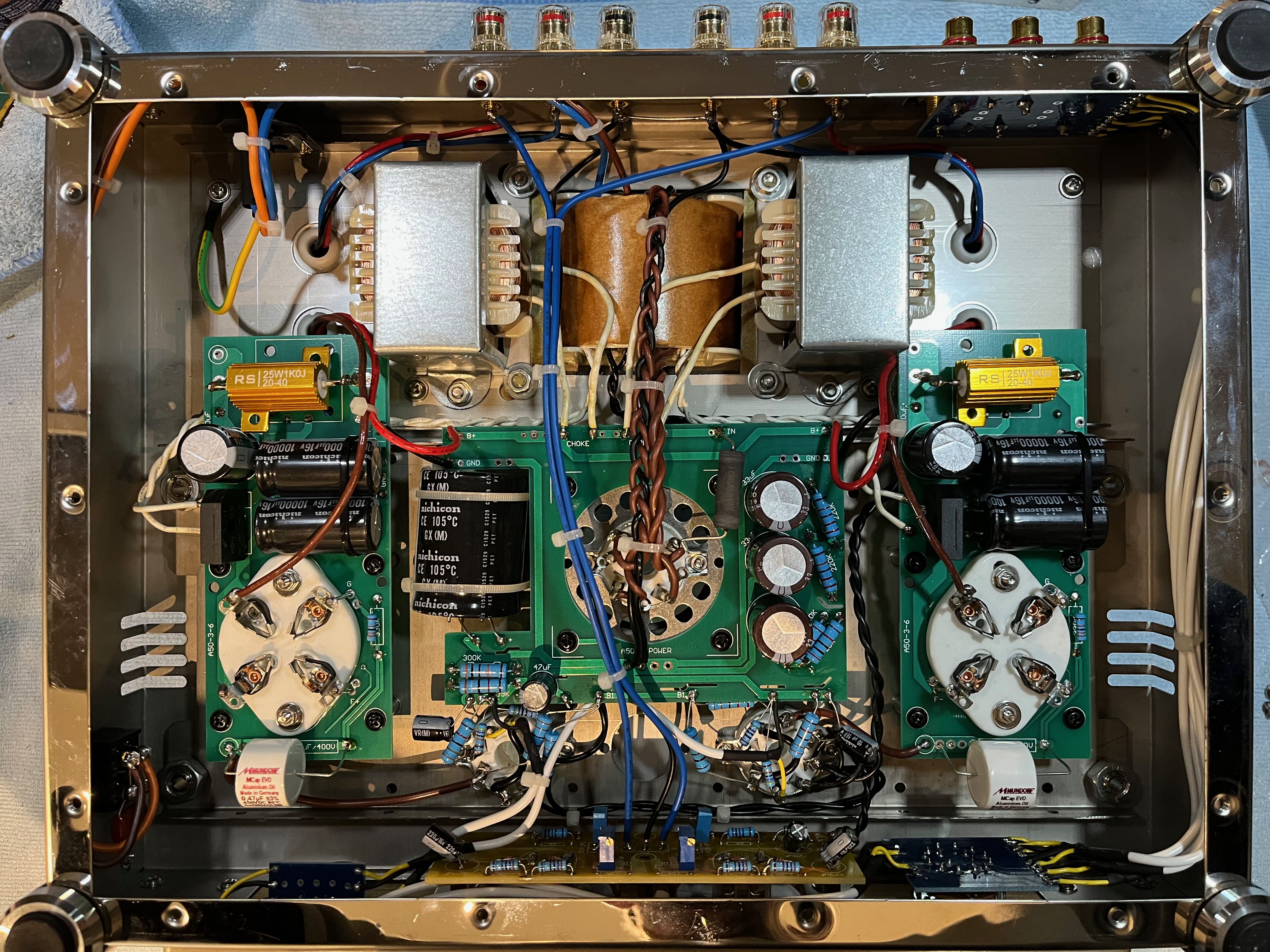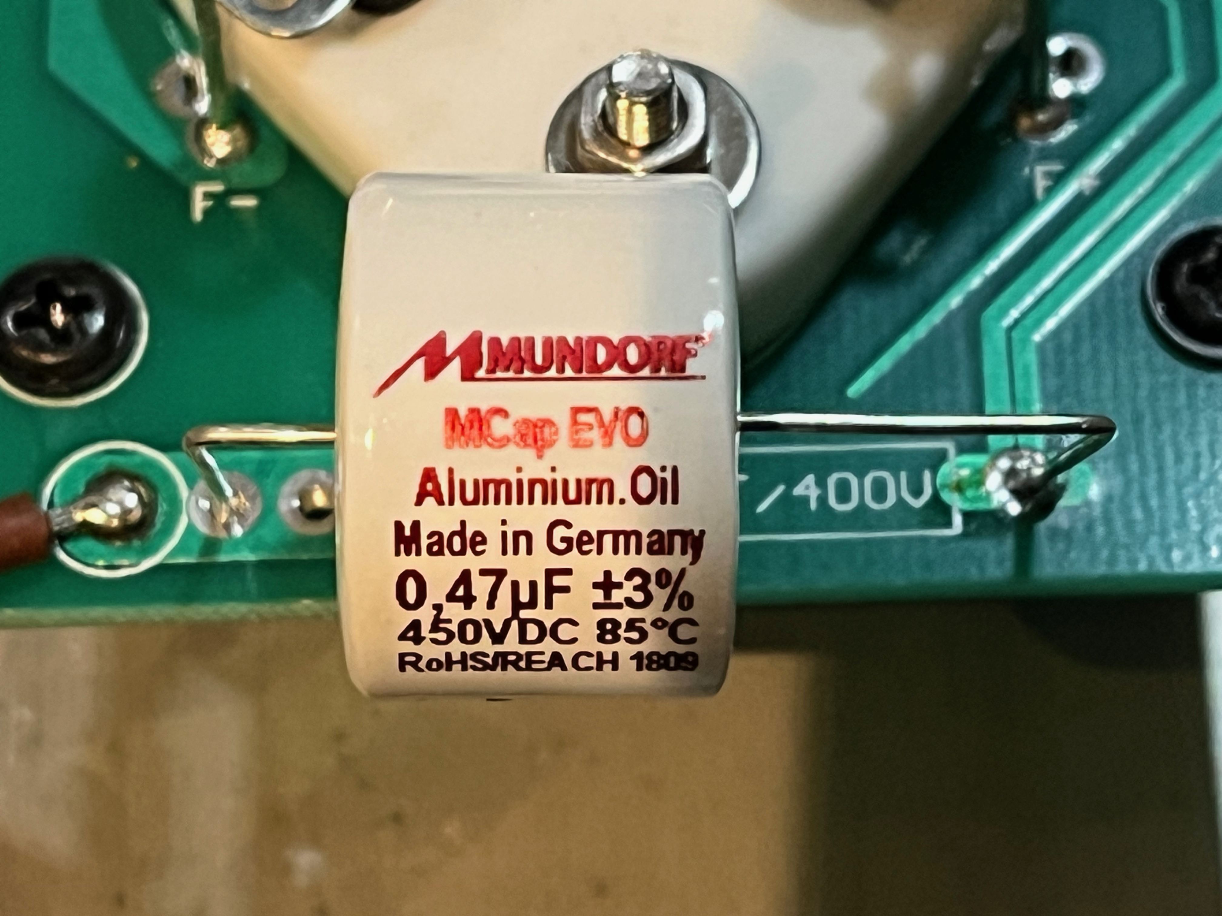 The OEM coupling caps were replaced with Mundorf EVO Aluminium Oil. I did not deem any other mods to be necessary for this amp. (Later models may definitely require some work). OEM caps are Nichicon or Rubycon.