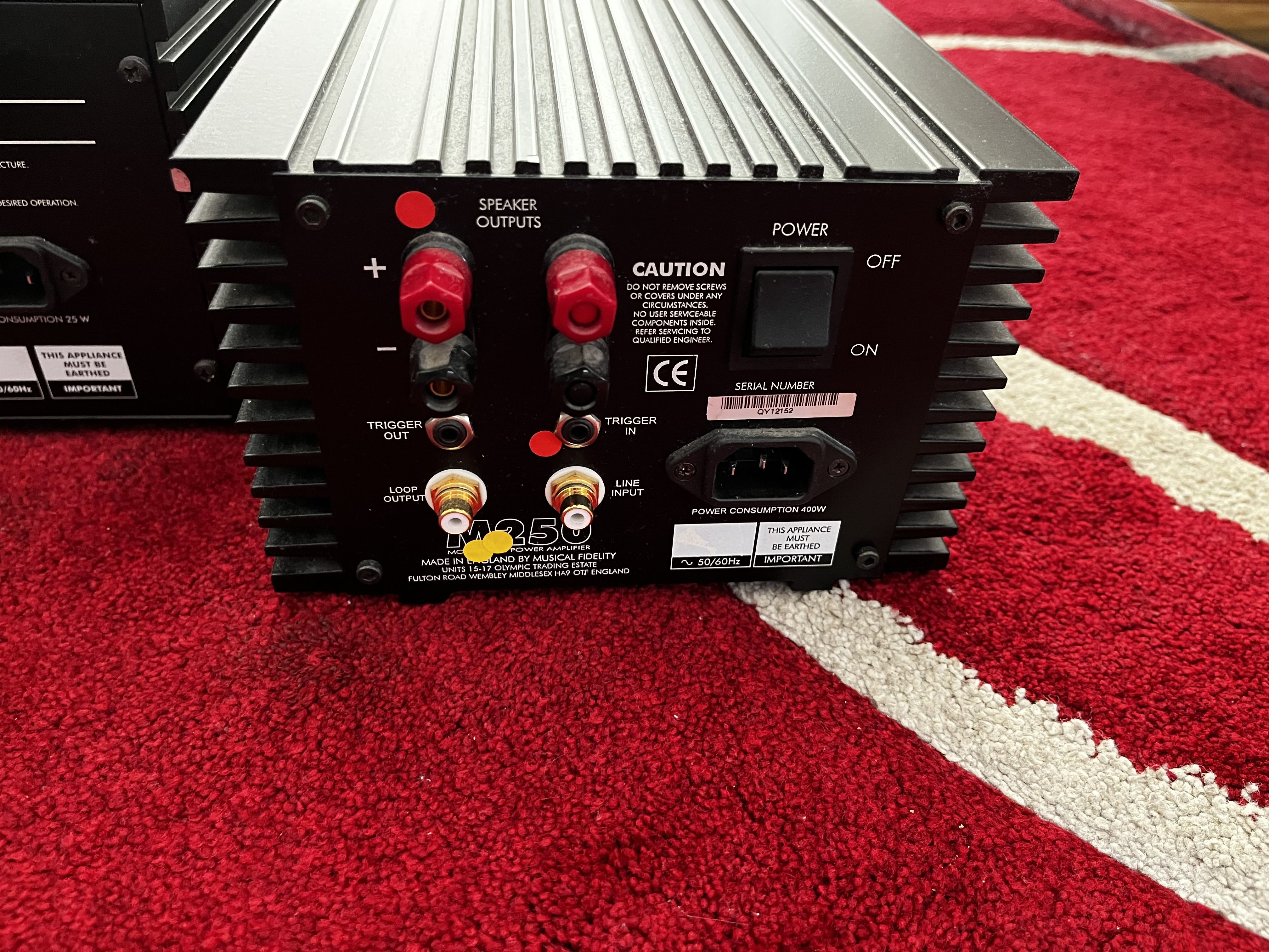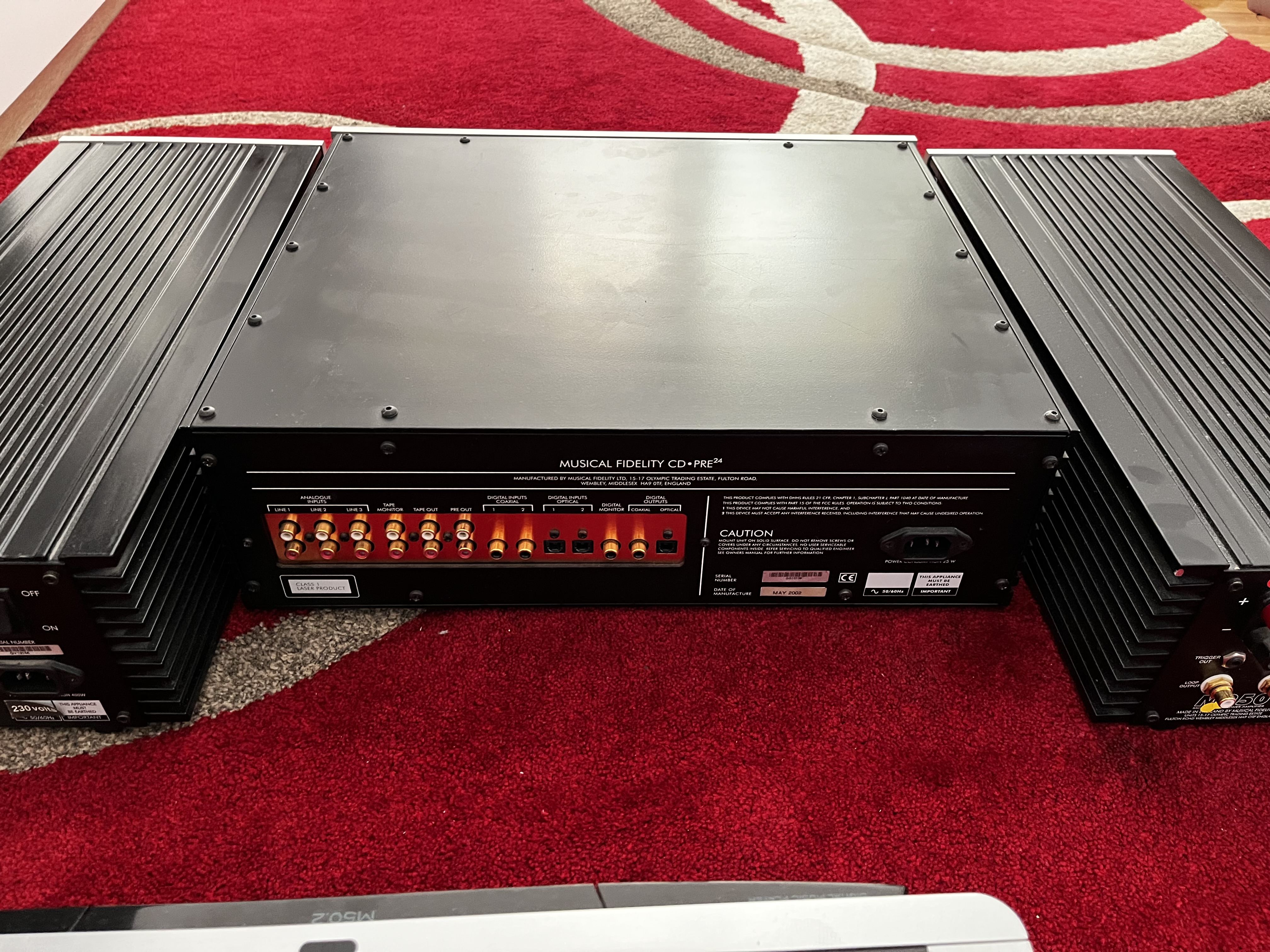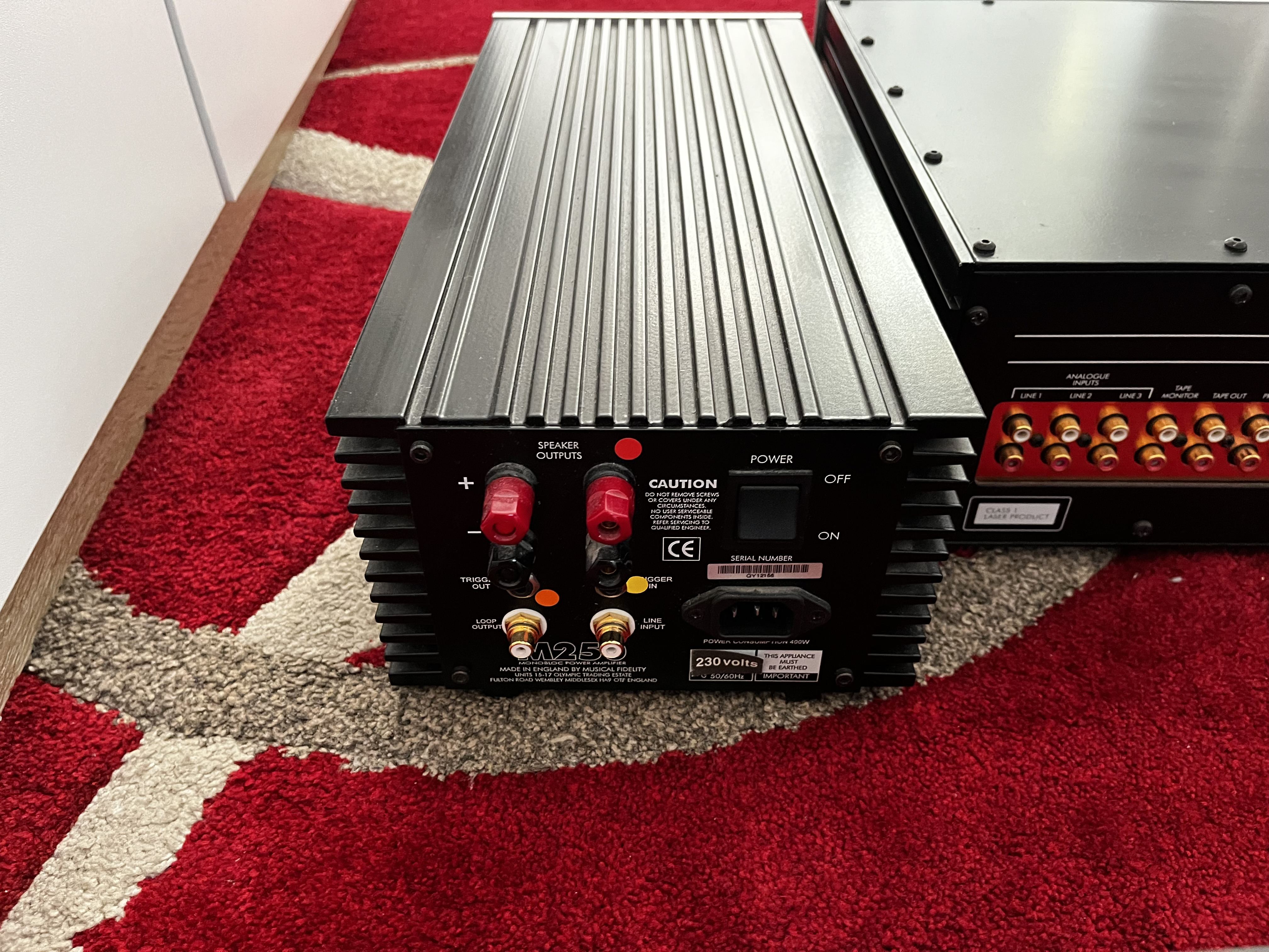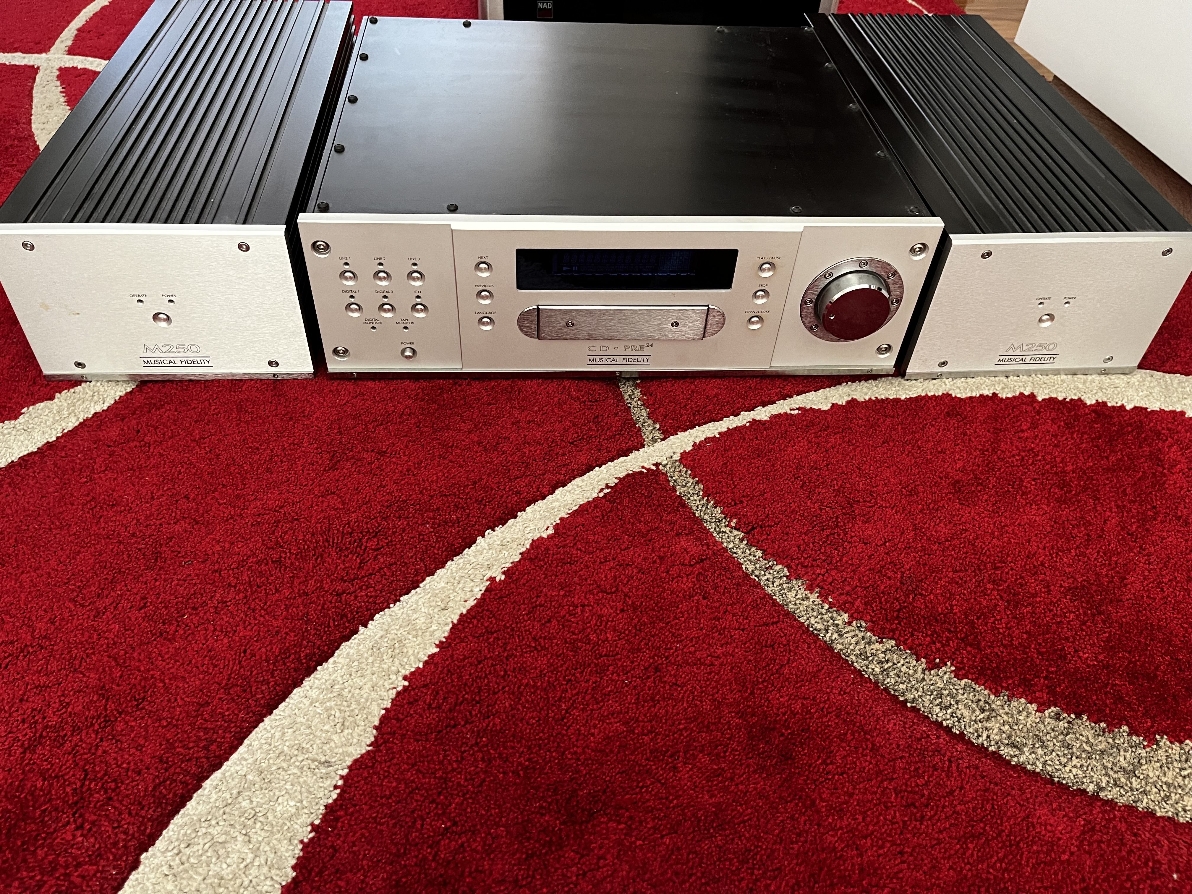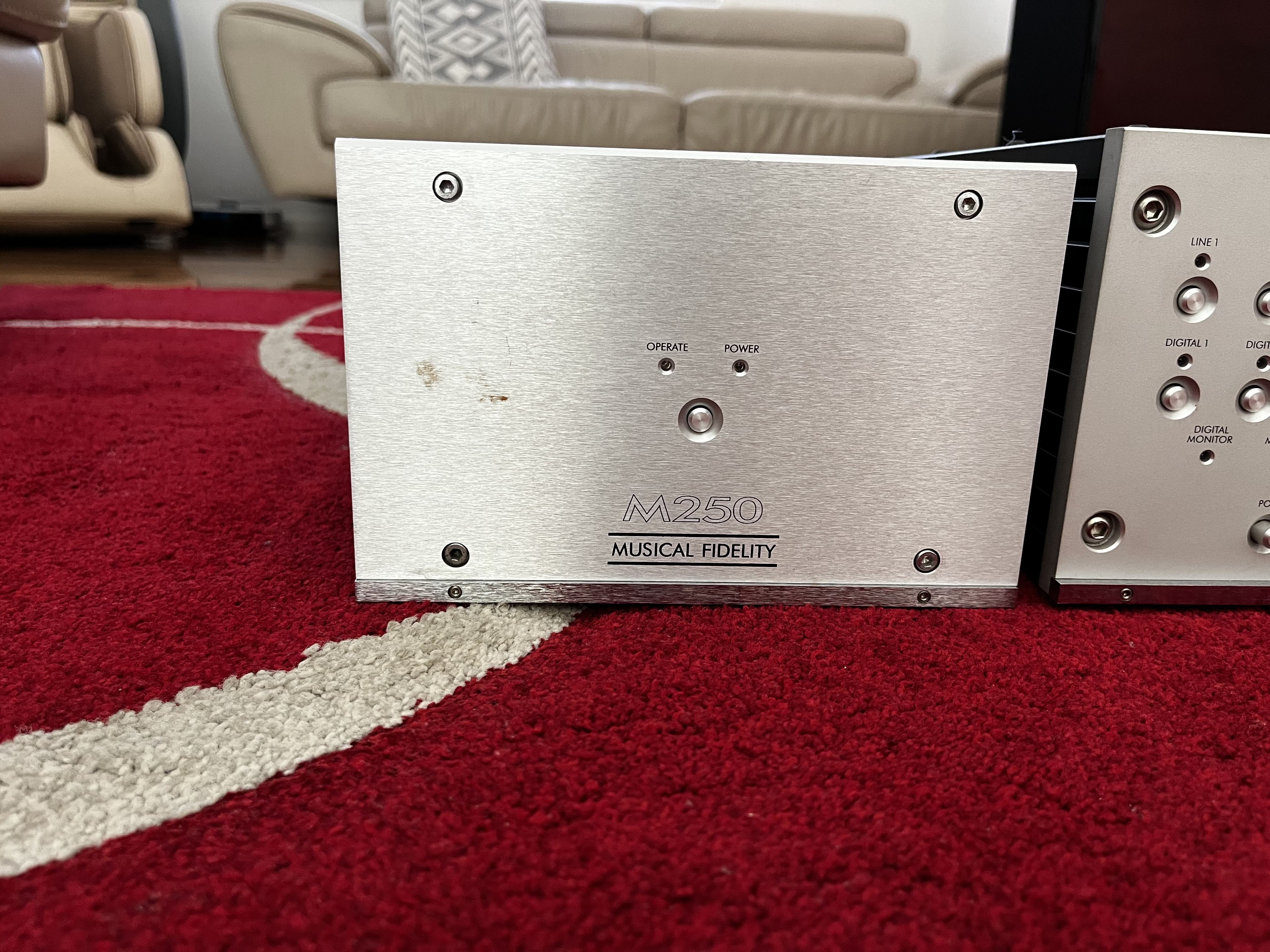 Further Information: for sale is an immaculate Musical Fidelity pre24 preamp / Cd /DAC and matching Musical Fidelity M250 Monoblock amps, rated at 250@8 ohms. Incredibly sounding system, preamp comes with original working remote and mono’s come with original packaging. One mono has a small mark as depicted in pictures. Pick up preferred due to weight, may consider separating.