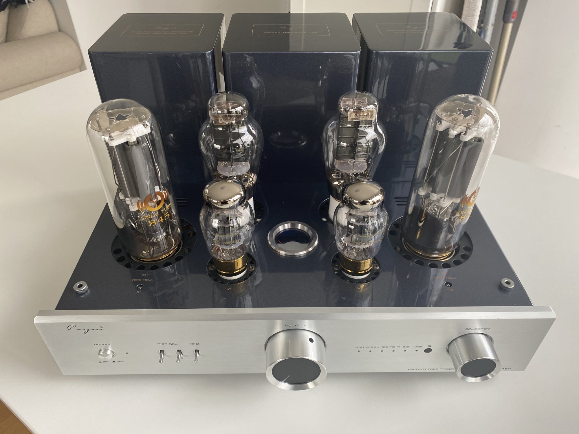 All tube Integrated with WE6SN7 voltage amplification stage, 300B driver tubes and 845 output tubes. 4 and 8 impedance cable terminals. Remote control and original packaging available.