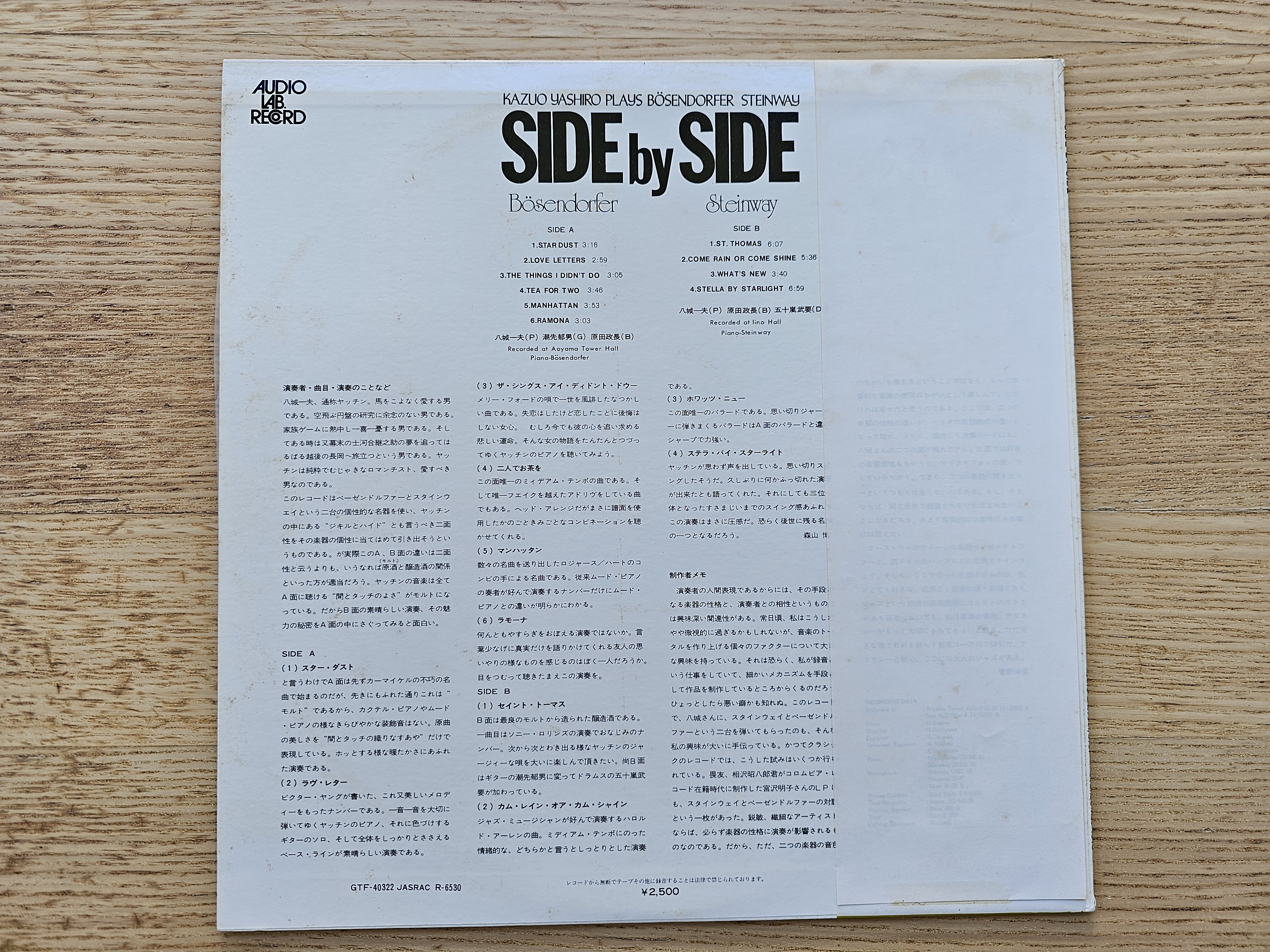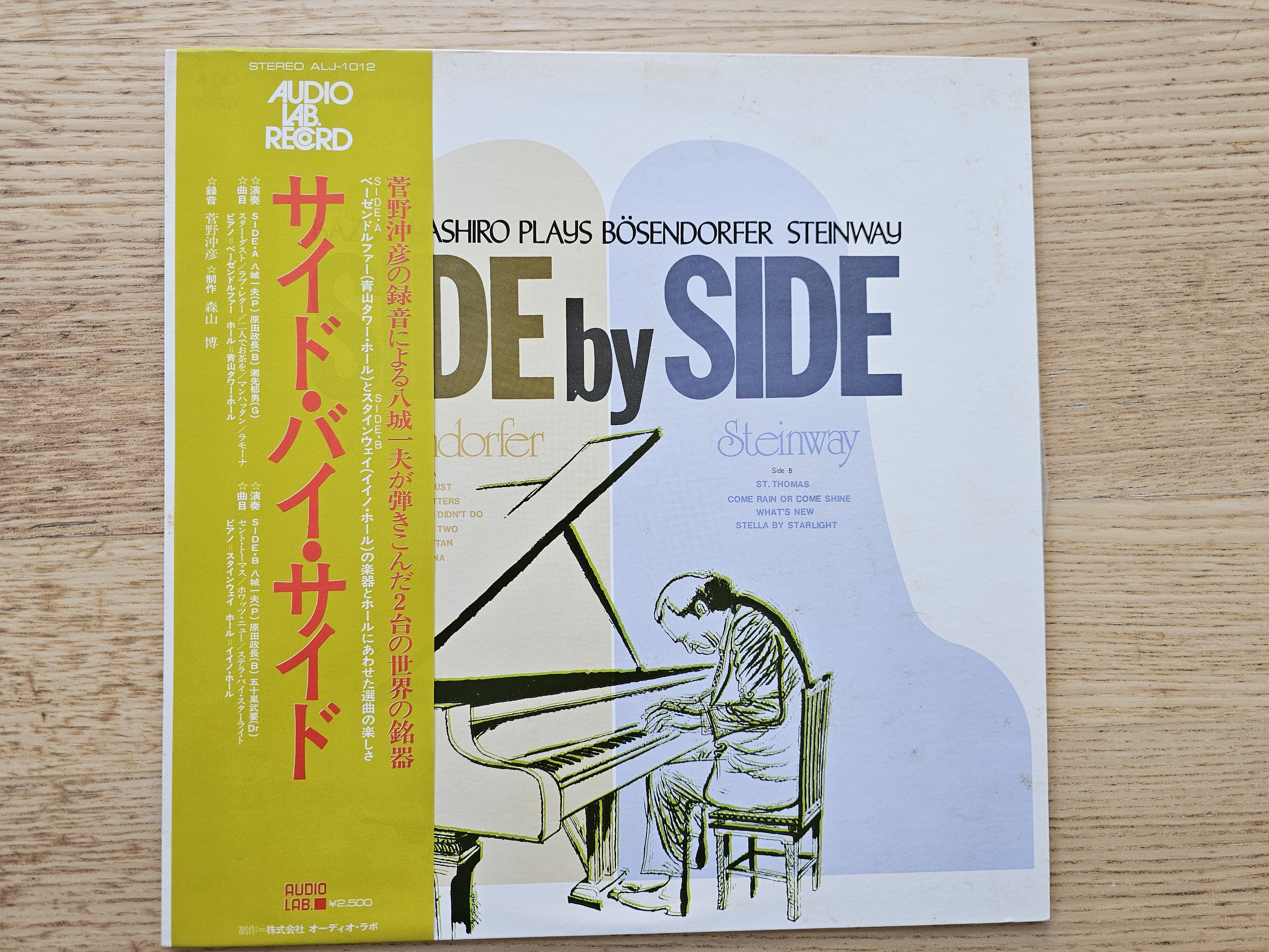 Kazuo Yashiro – Side By Side. Kazuo Yashiro Plays Bösendorfer & Steinway, EX/NM-/obi EX+, foxing to cover & label of LP, original 1974 Japan press, $55