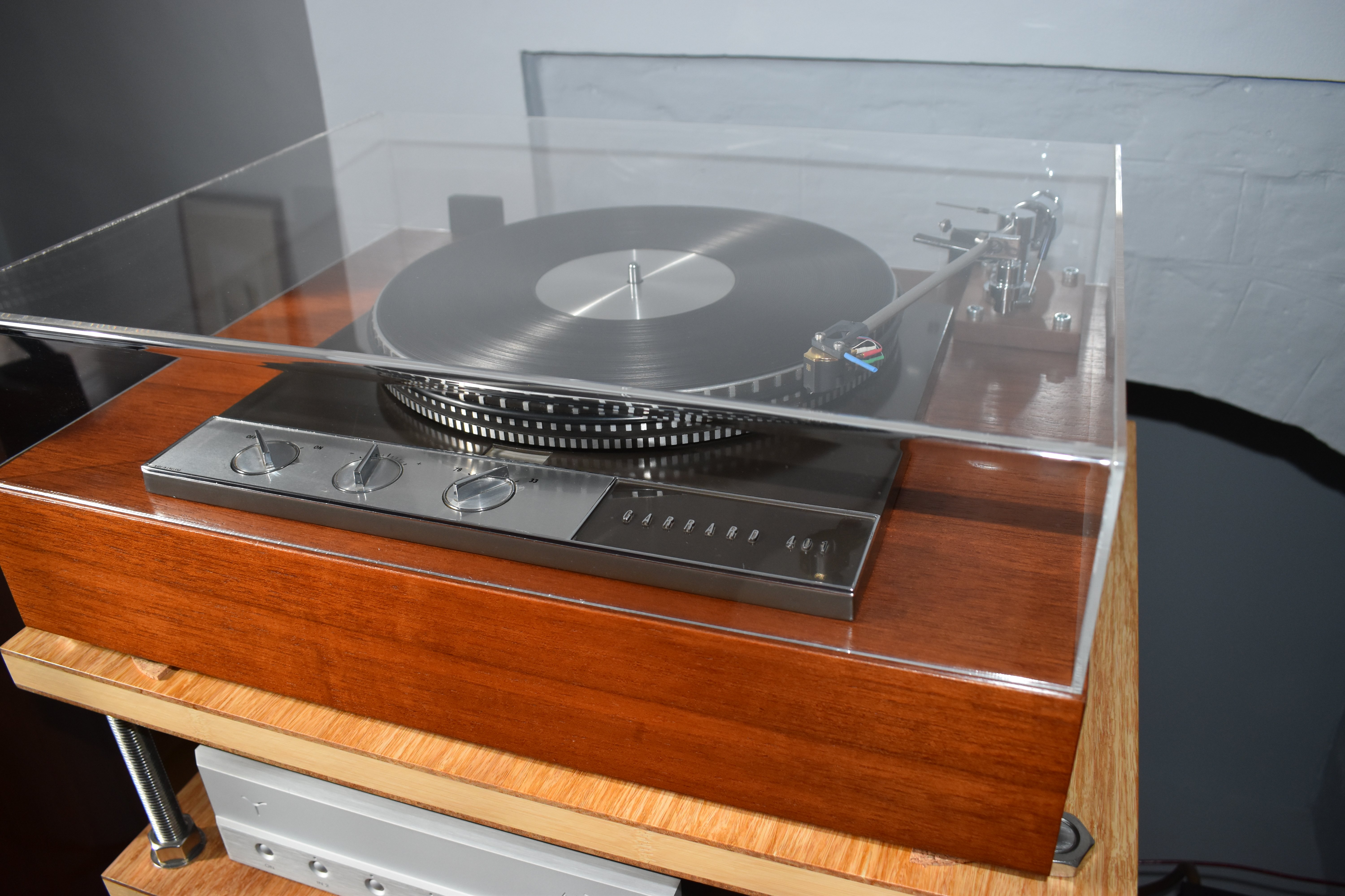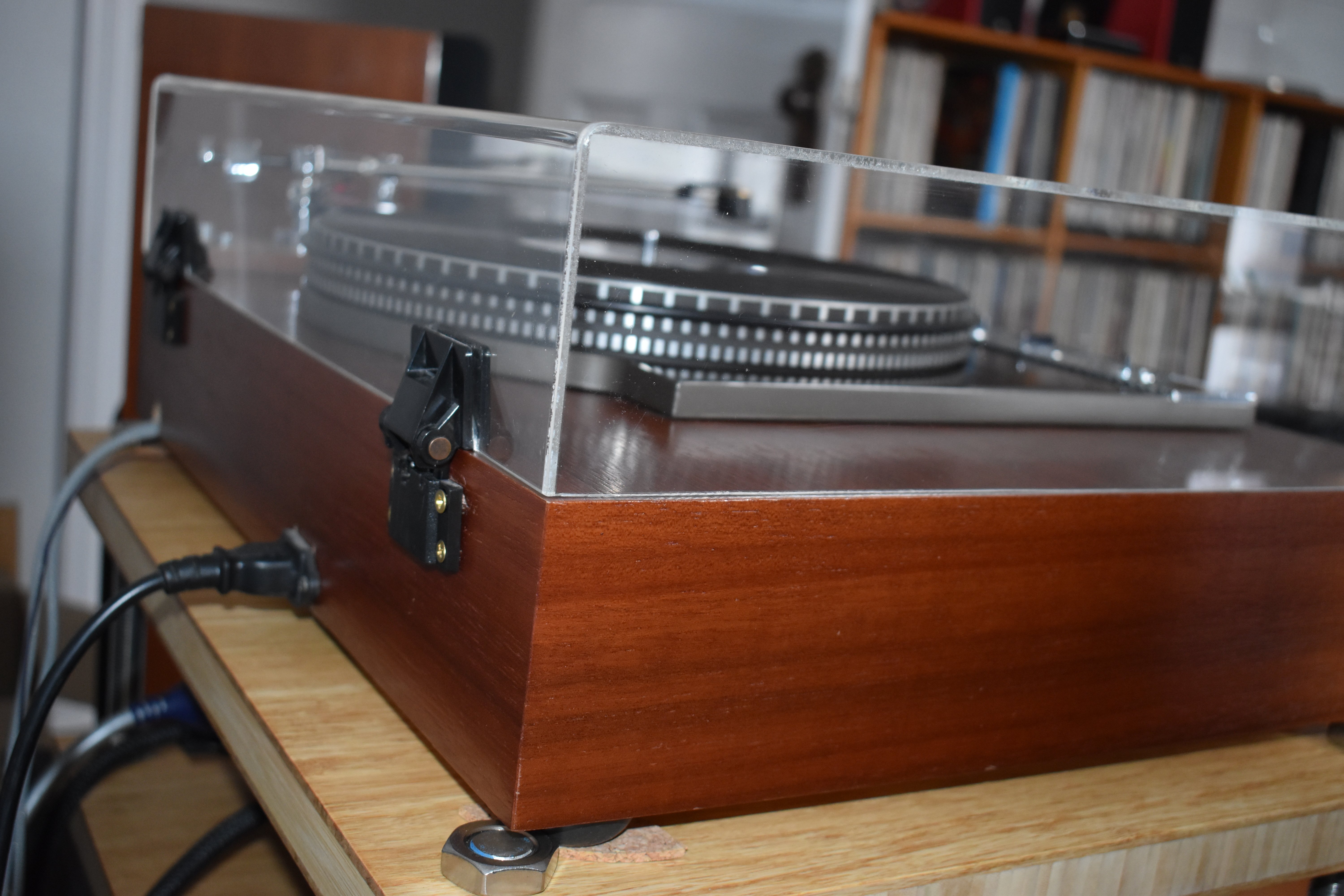 The turntable is unmodified apart from the fitting of an SMD spindle bearing thrust pad from Peak HiFi; the original thrust pad is still serviceable and can be easily reinstated if desired. The platter mat is original.
