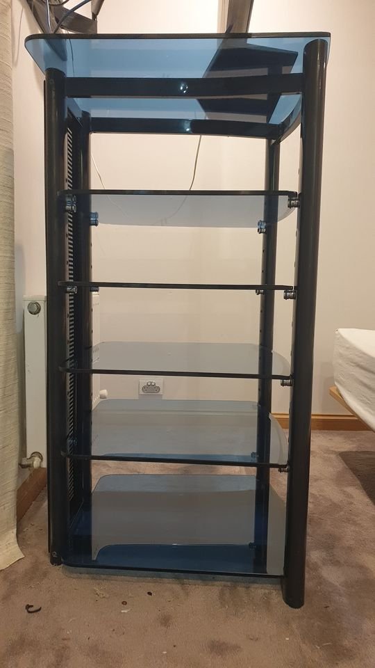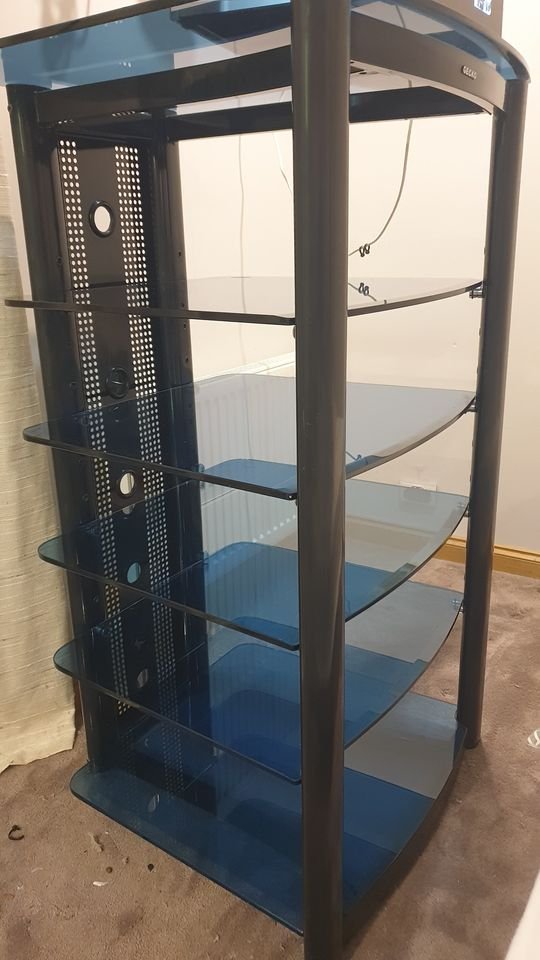Further Information: Heavy duty Gecko 6 shelf Hi-Fi rack. Shelves are 10mm? Tempered glass, blue.