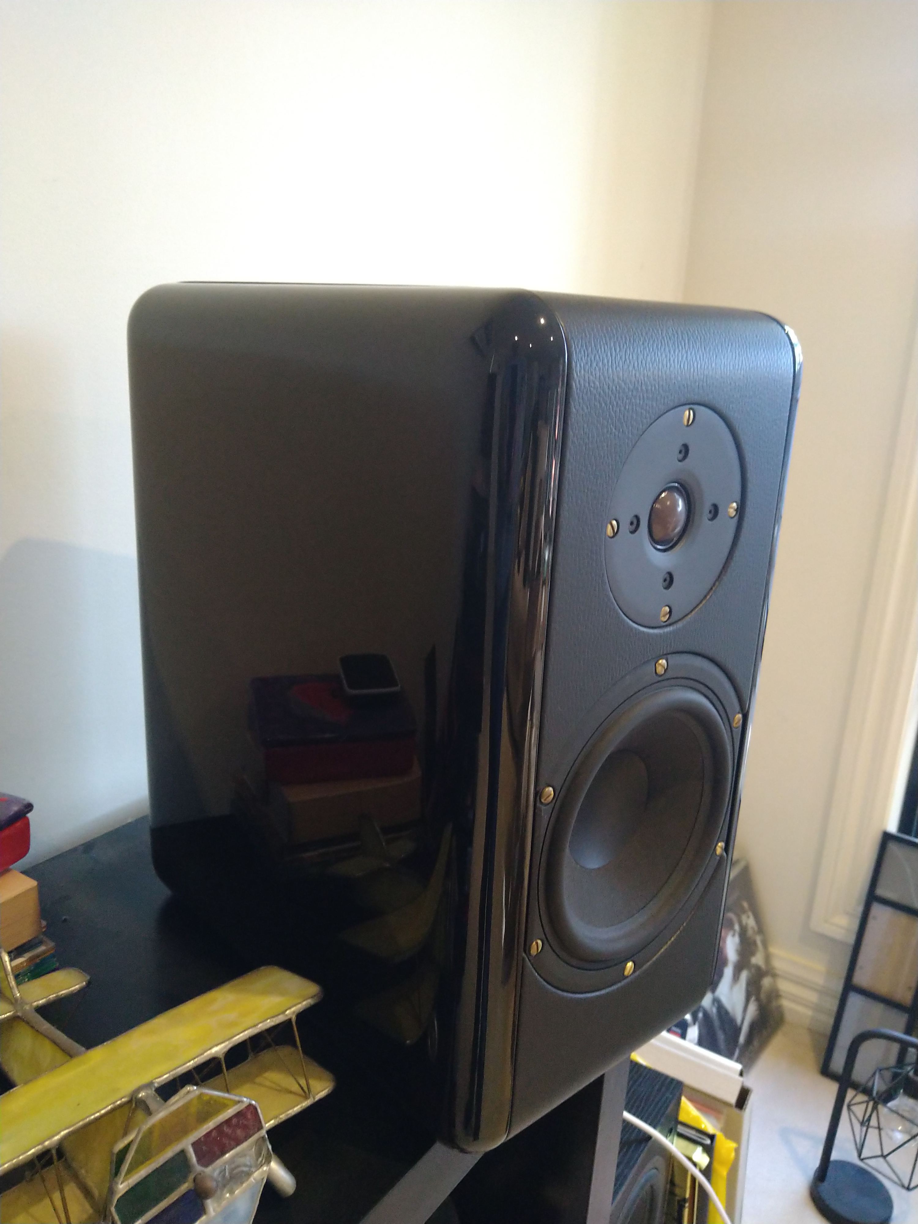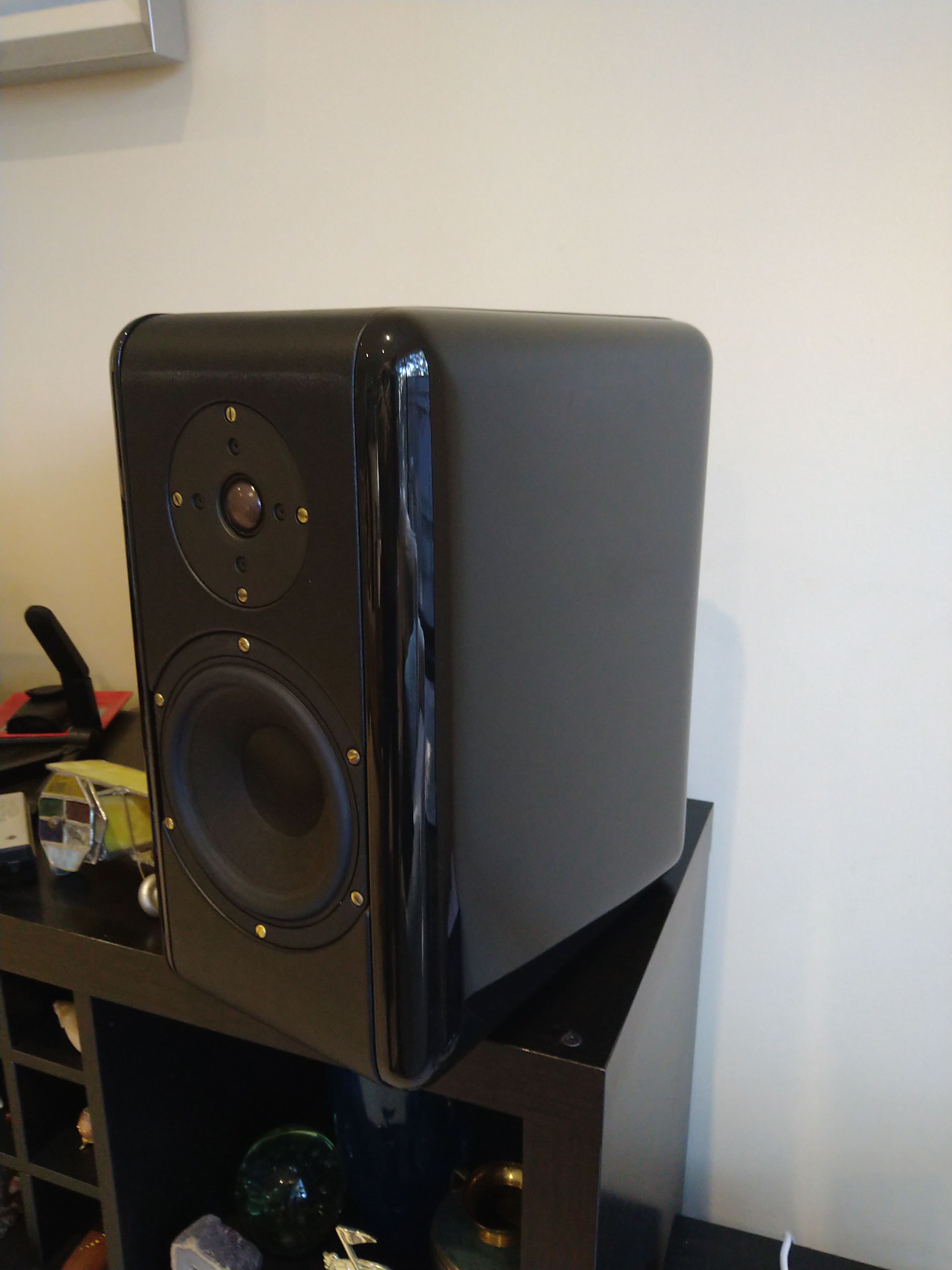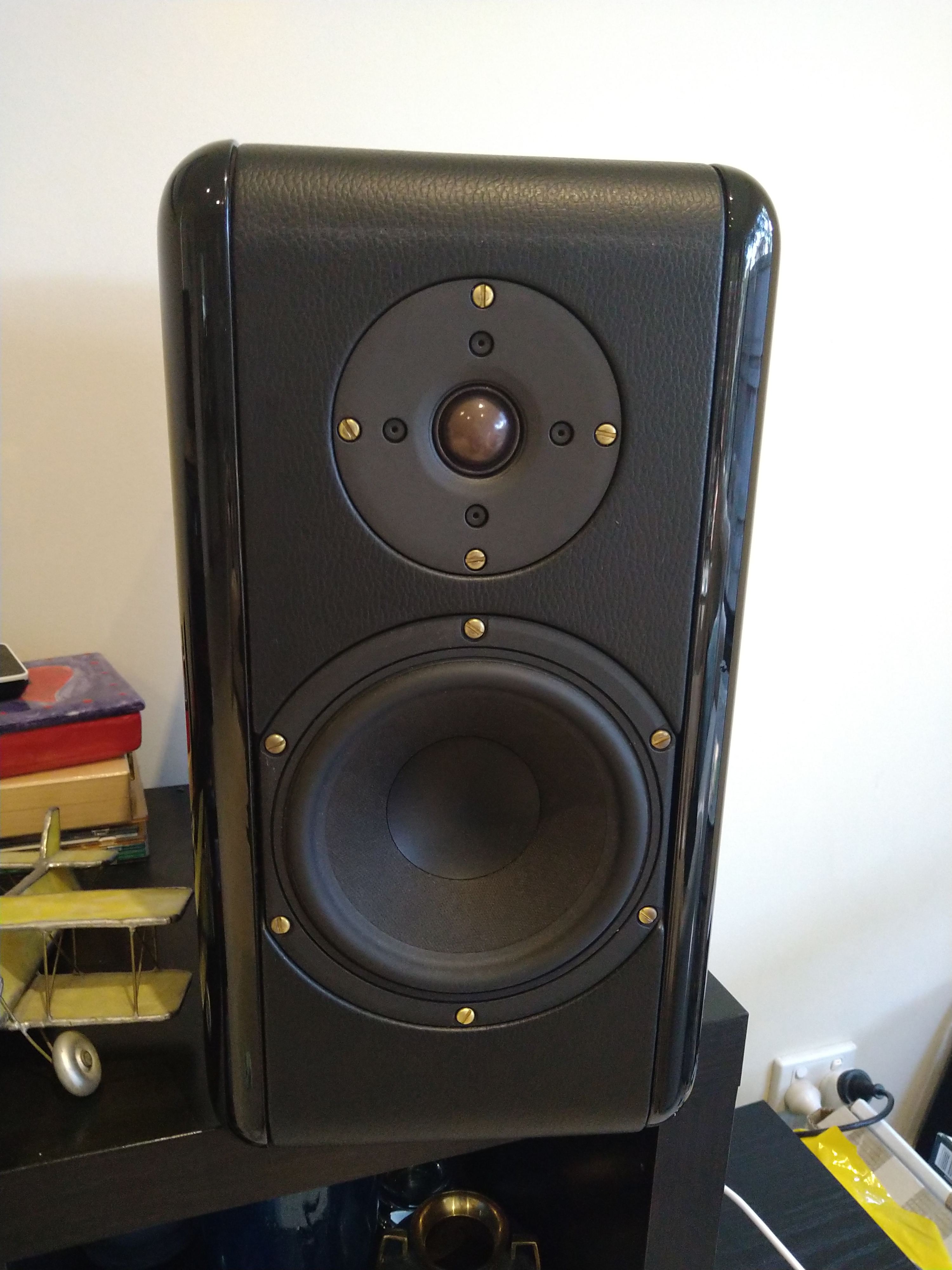 They look absolutely magnificent in the Piano Gloss Black with leather surrounds. They are unmarked other than the footprints from the ETI toppers that I had on them.