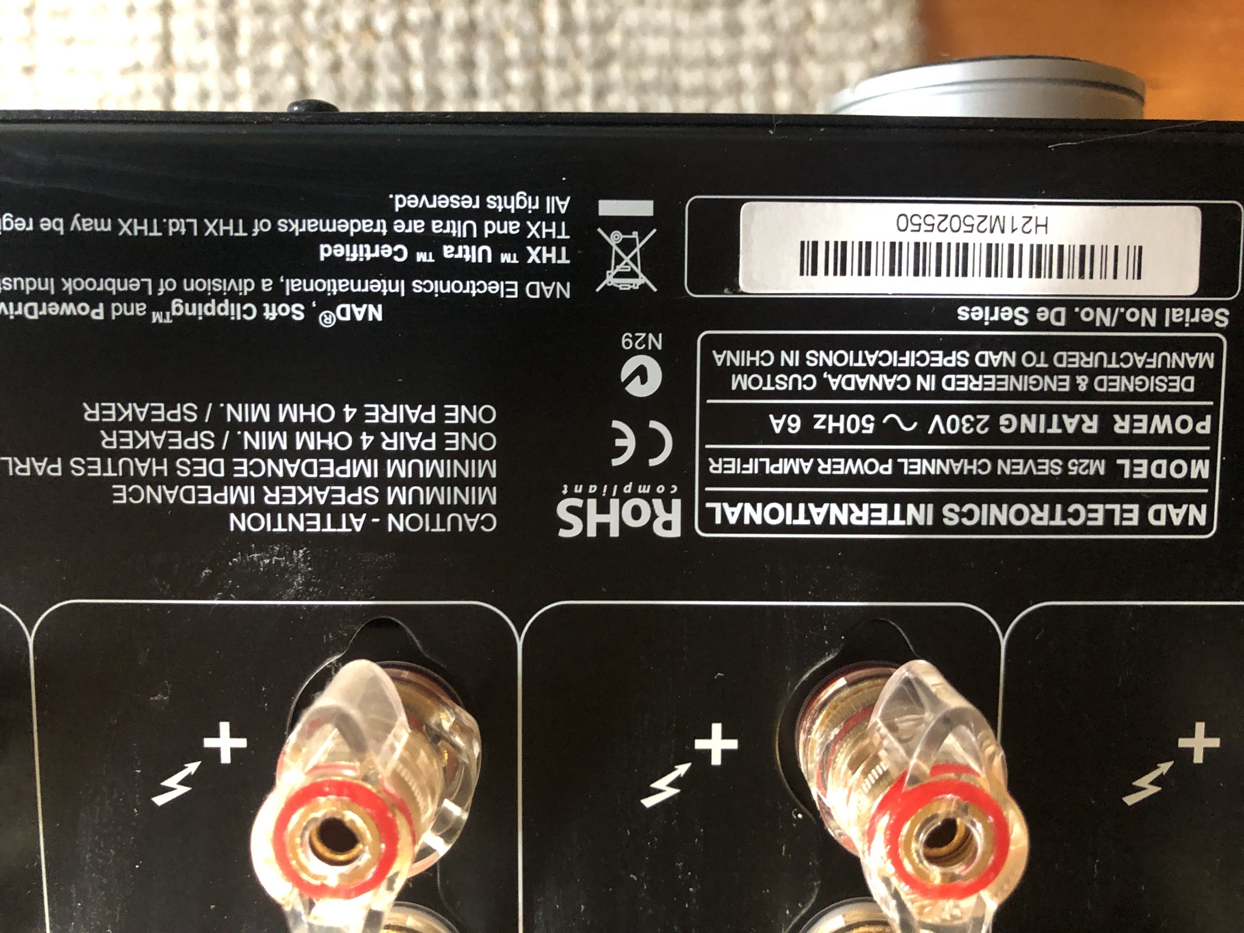 The M25 is actually made up of seven individual mono block amplifiers with each channel using a balanced junction FET input stage to eliminate cross-talk, resulting in exceptionally low levels of noise and distortion. Additionally, NAD employs a unique electronic ground isolation circuit to prevent ground loop noise in the system-a common problem with many complex multi-channel systems.