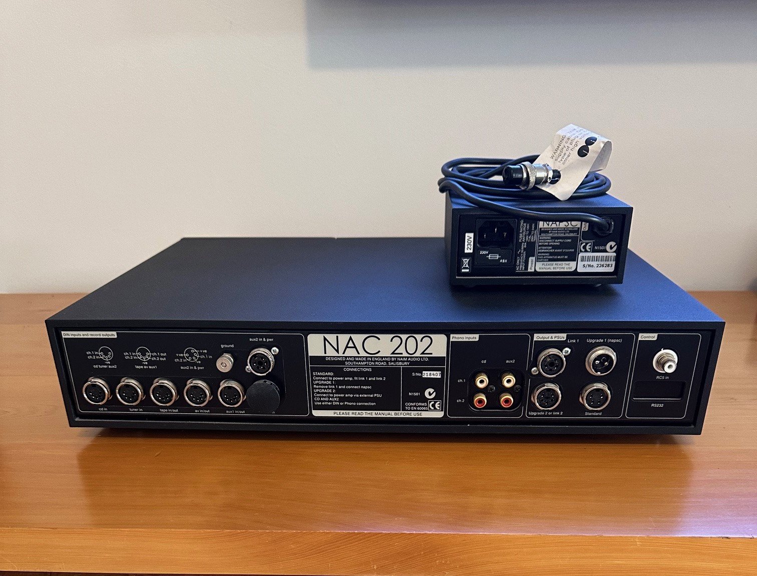 The NAC 202 comes with the SNAIC 5-pin to 5-pin cable, the remote control, and a NAPSC Upgrade power supply for the control and logic functions. The 202 will be sent in the original NAIM box, but not the NAPSC (added later).