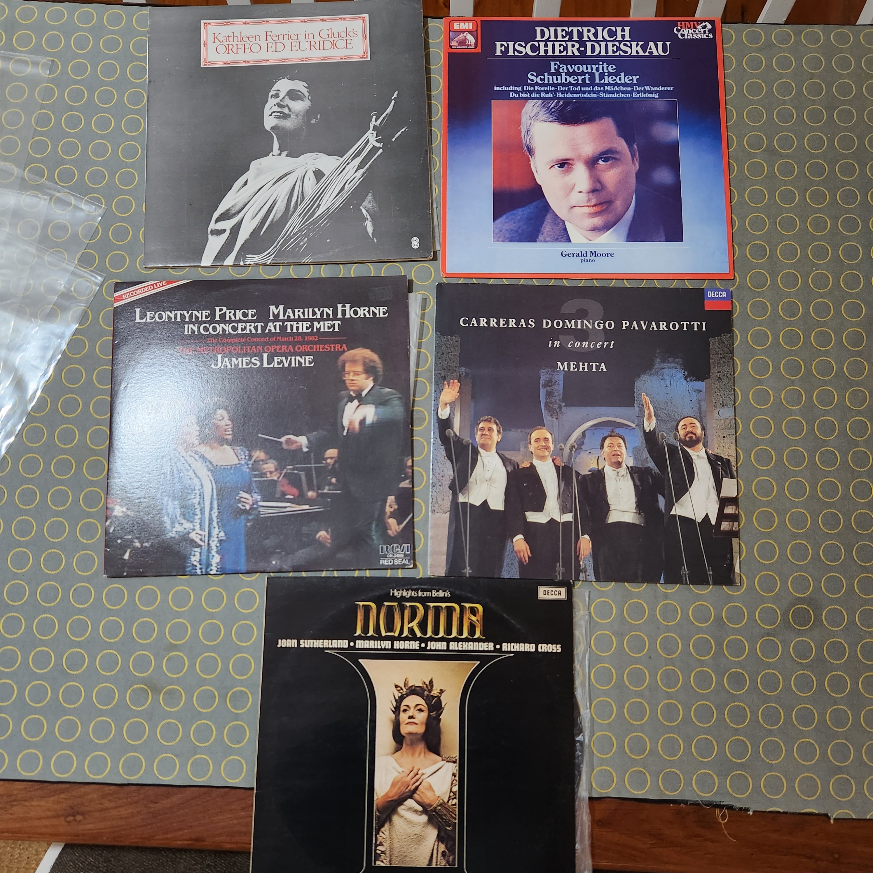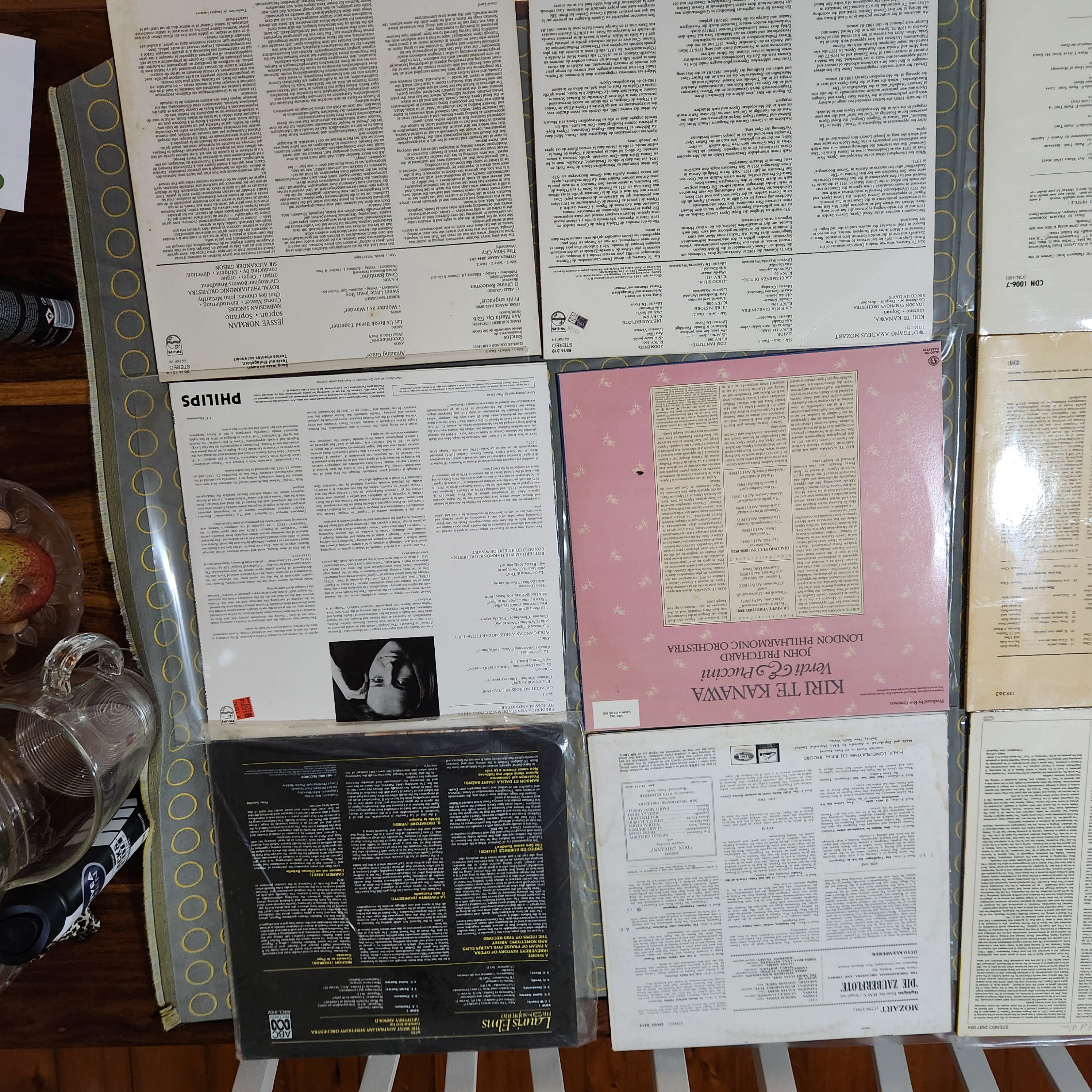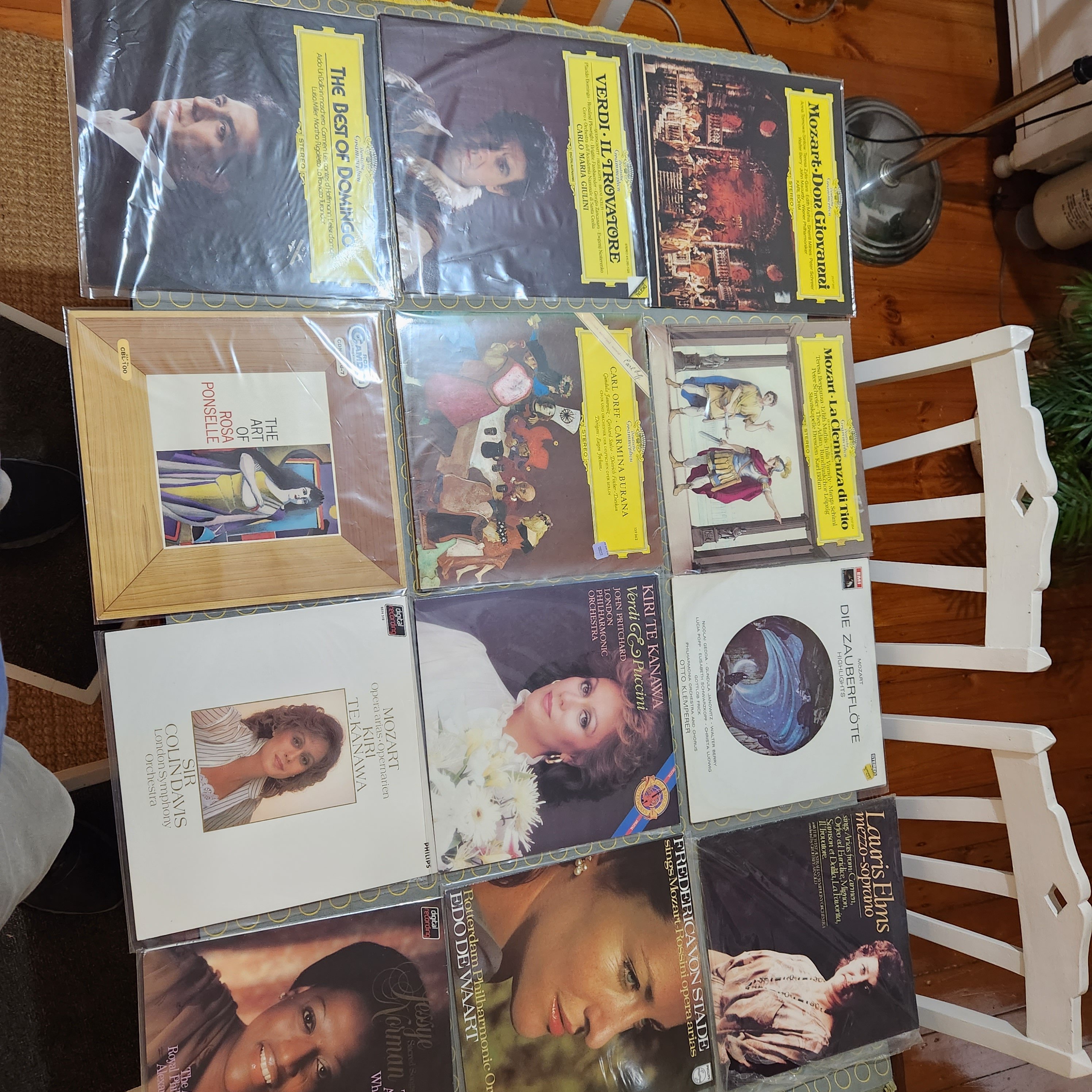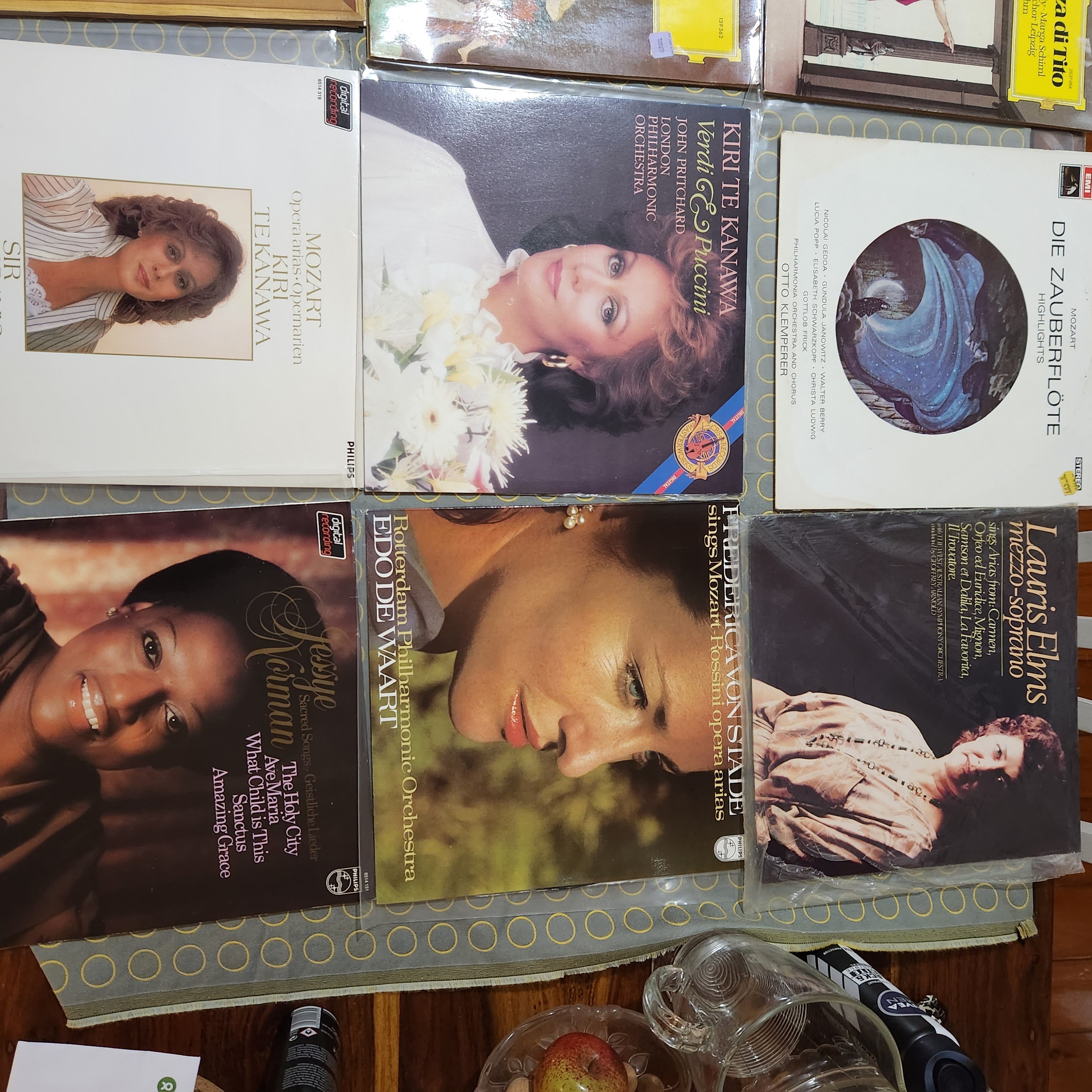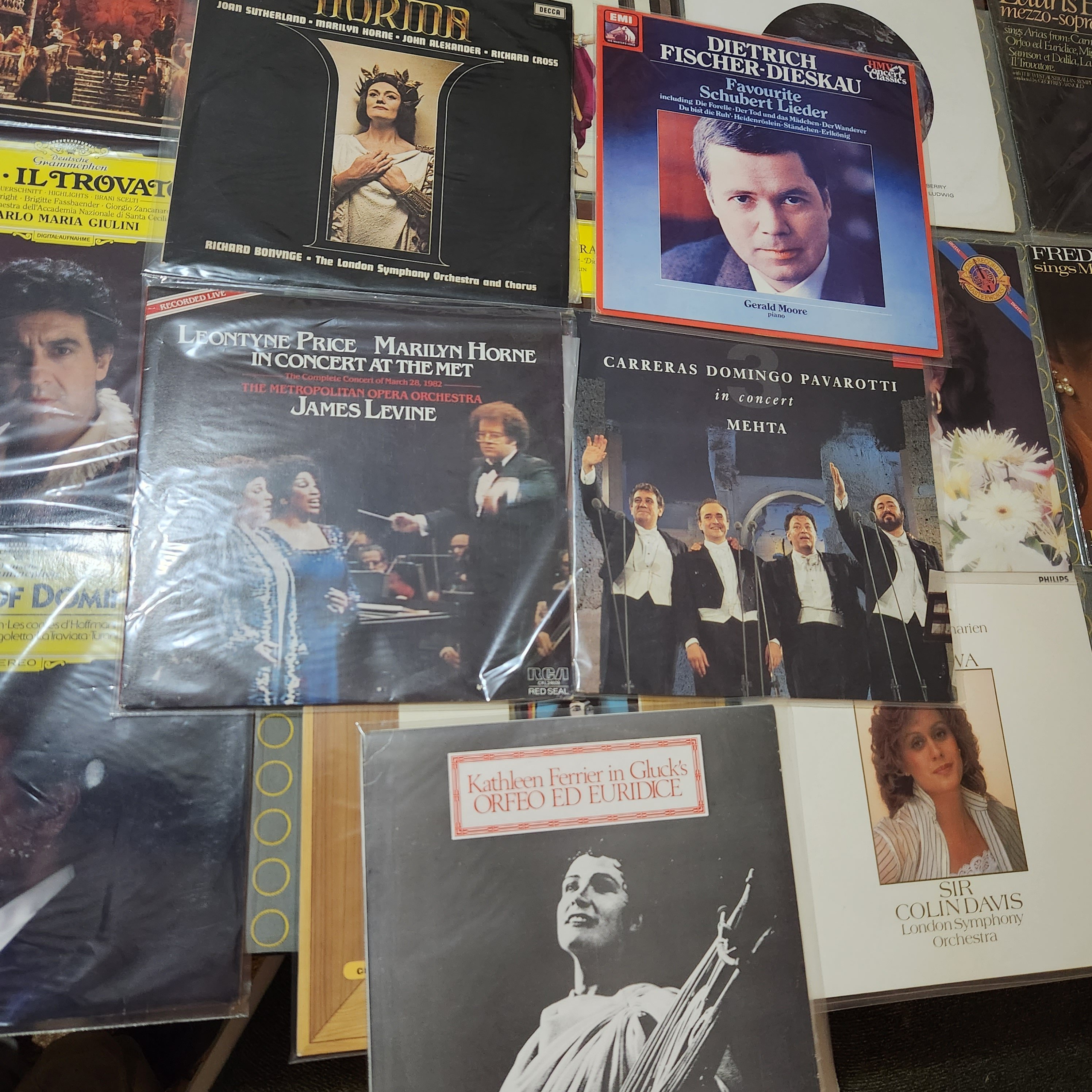 All discs are scuff free, a few faint hairlines on Zauberflöte. side 1 of the Levine, Horne, Price Concert 2 x LP has some minor hazing, DNAP. A few discs have some minor run-in noise, resolves before band 1 starts except Jesse Norman & Klemperer/ Mozart. The DG pressings, e.g., Tito, are at the VG+++ SQ end.