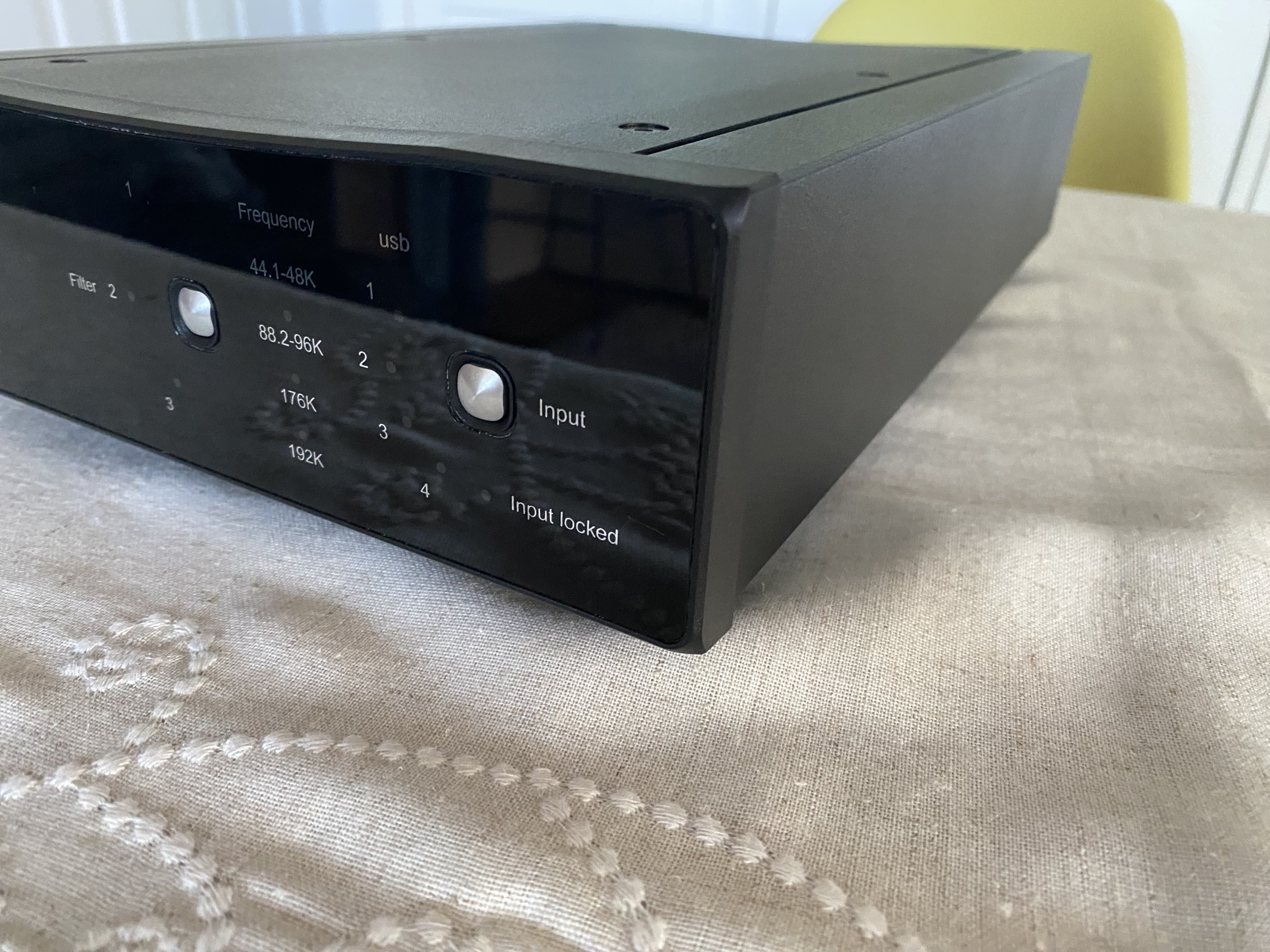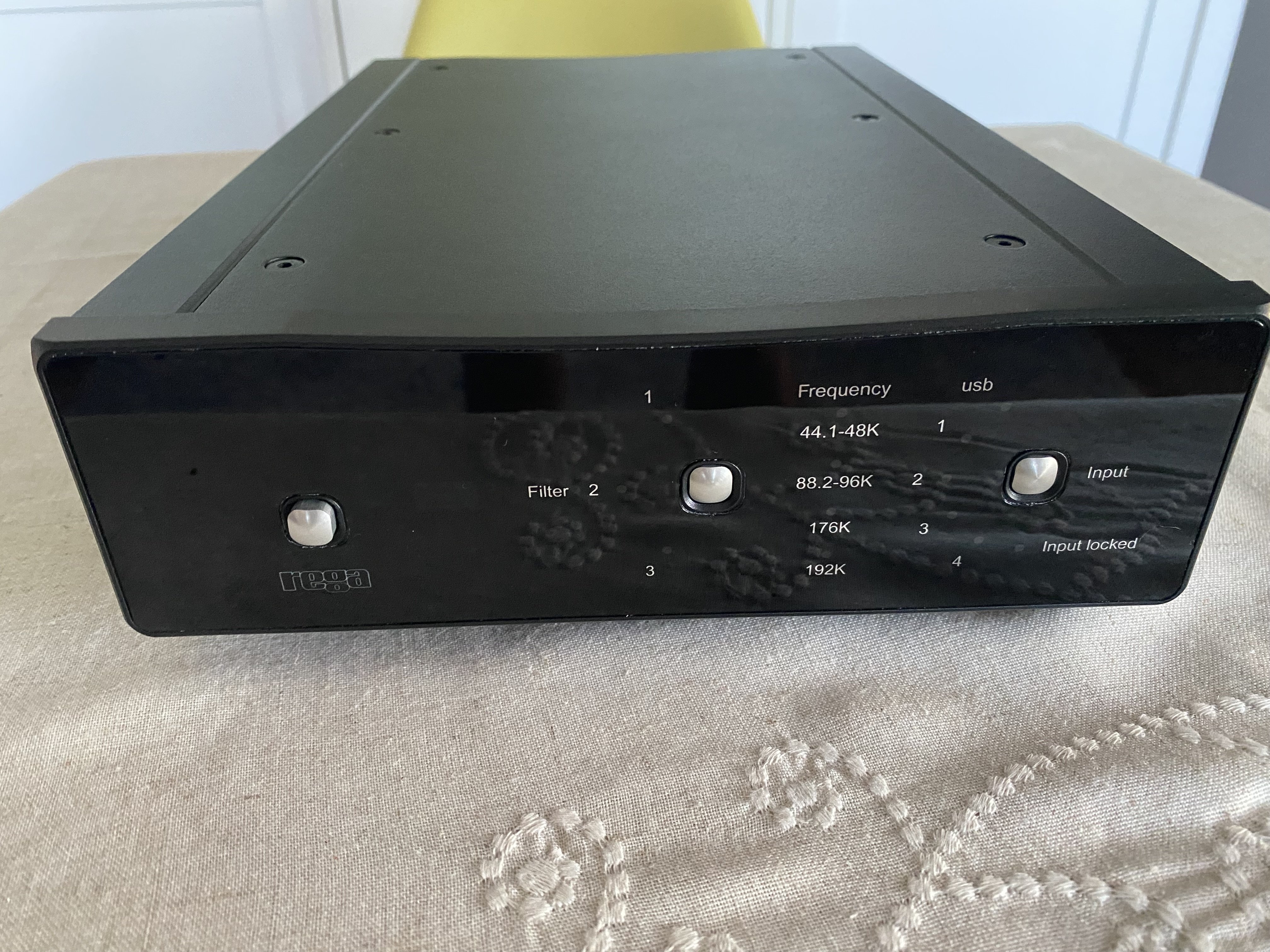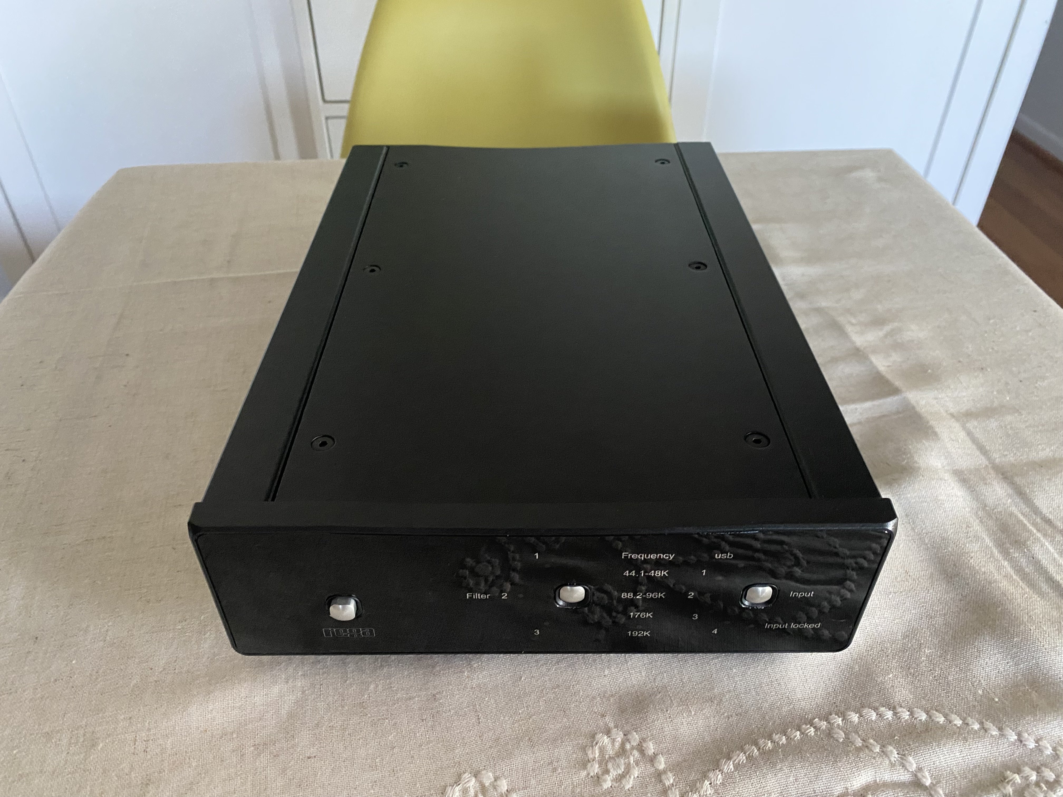 Solid-state D/A processor. Digital inputs: USB: 24-bit 44.1/48/88.2/96/176.4/192kHz. Optical/TosLink 1 & 2: 24-bit 32/44.1/48/88.2/96/176.4/192kHz. Coaxial 1 & 2: 24-bit 32/44.1/48/88.2/96/176.4/192kHz. Bit resolution (all inputs): 16 to 24-bit. Supported data rates: 32, 44.1, 48, 88.2, 96, 176.4, 192kHz. Frequency response (100k ohms load:) Filter 1 selected. Low data rate, 10Hz–20.02kHz, –0.05dB (44.1kHz), 10Hz–21.7kHz –0.03dB (48kHz). Medium data rate: 10Hz–28.7kHz, –0.05dB (88.2kHz), 10Hz–31.2kHz, –3dB (96kHz). High data rate: 10Hz–44.1kHz, –0.05dB (176.4kHz) 10Hz–47.7kHz, –3dB (192kHz).Maximum output level: 2.175V into 100k ohms load. Total harmonic distortion, all inputs (24/96): 0.006% at 1kHz. Signal/noise ratio: 105dB, relative to maximum output level with a 100Hz–22kHz bandwidth.