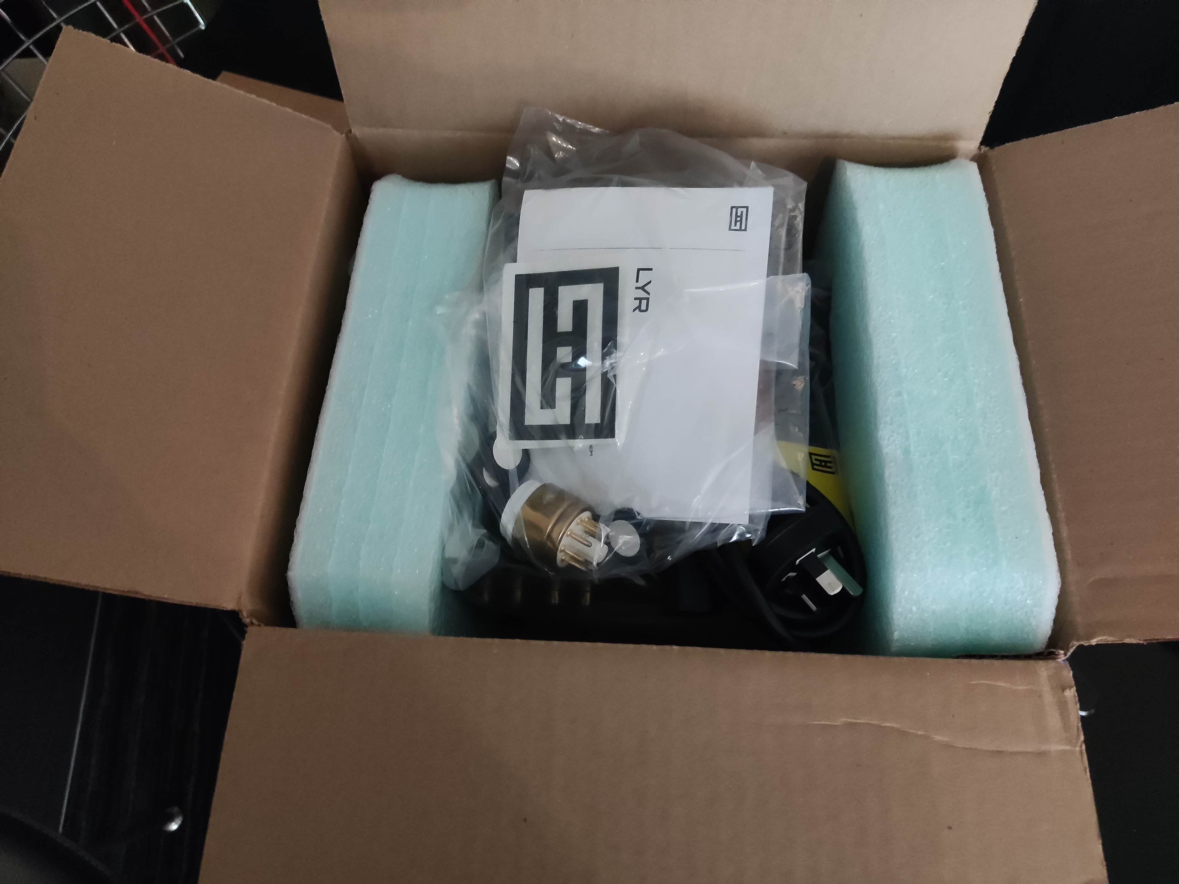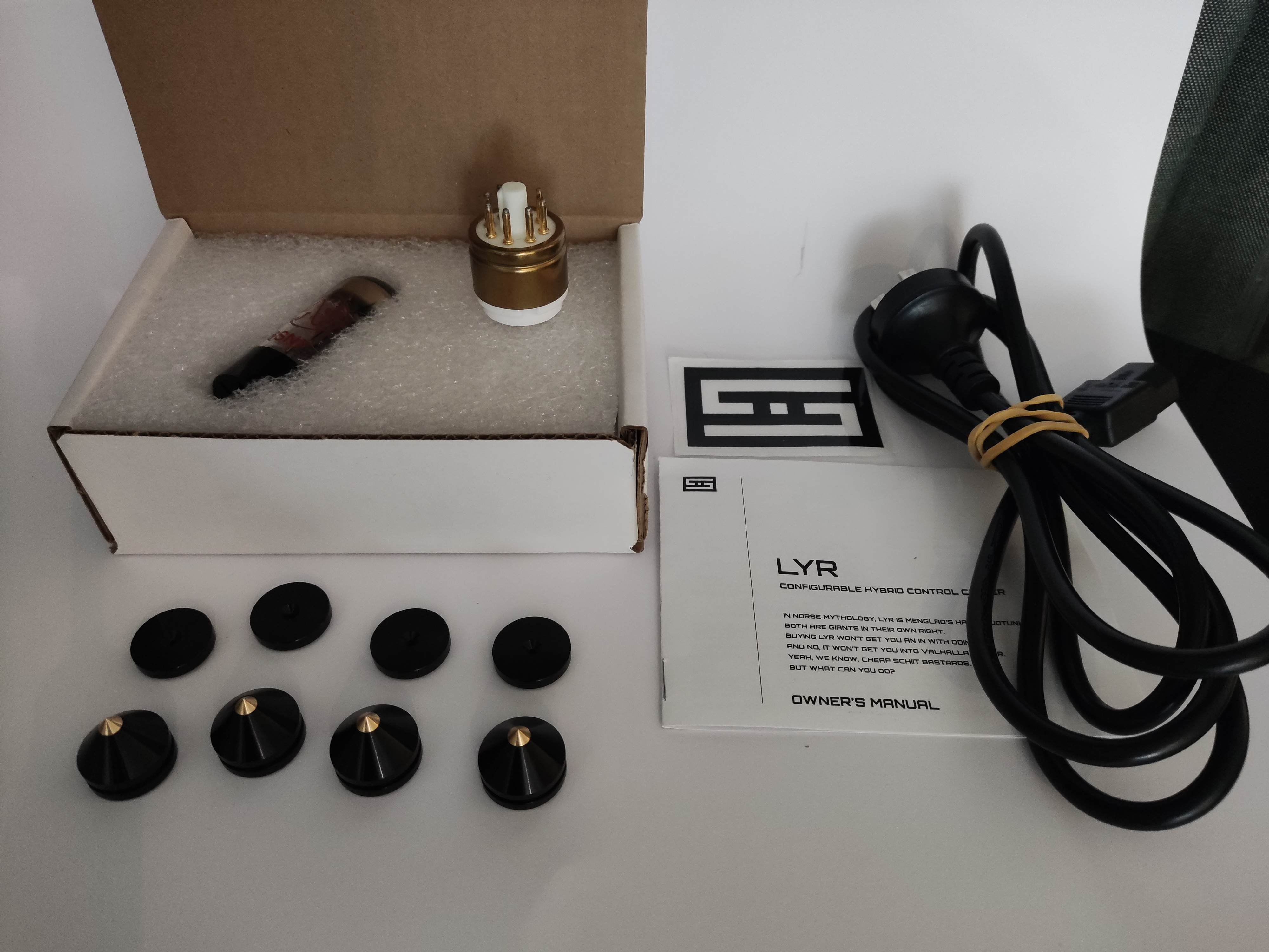 Comes with the original Schiit-supplied tube (not in photo sorry, but there), a tube extender to raise the valves above the case, and extra isolation feet for air circulation