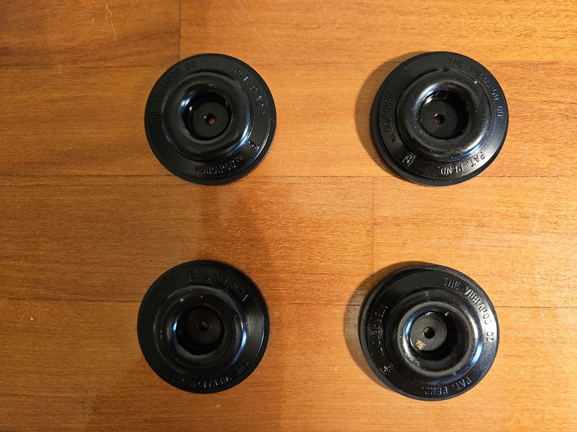 VIBRAPOD Isolators may leave rings on woods, acrylics, and painted surfaces. They may also dissolve the paint, especially if it is lacquer. To protect these surfaces and your equipment please use BAR COASTERS or PLAYING CARDS between the VIBRAPOD Isolators and these surfaces.