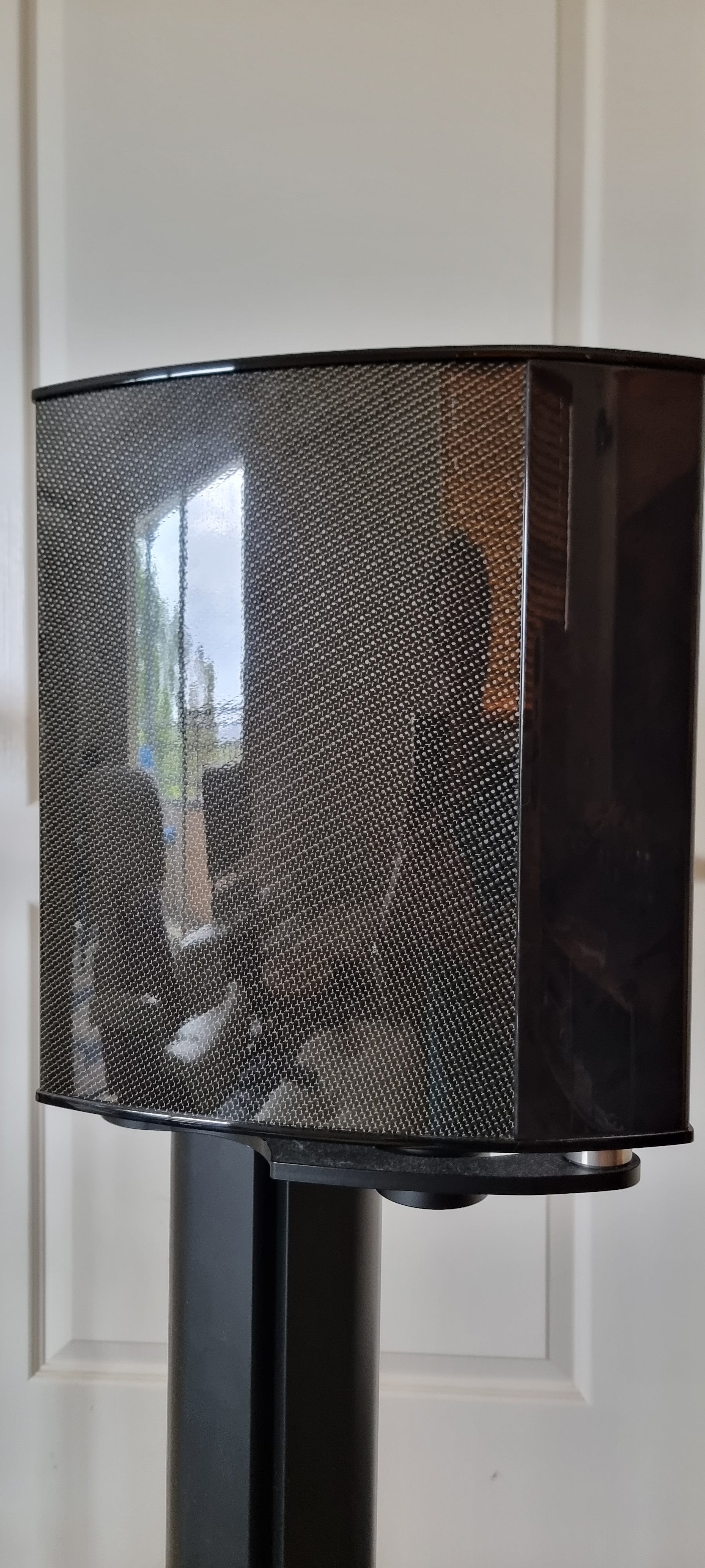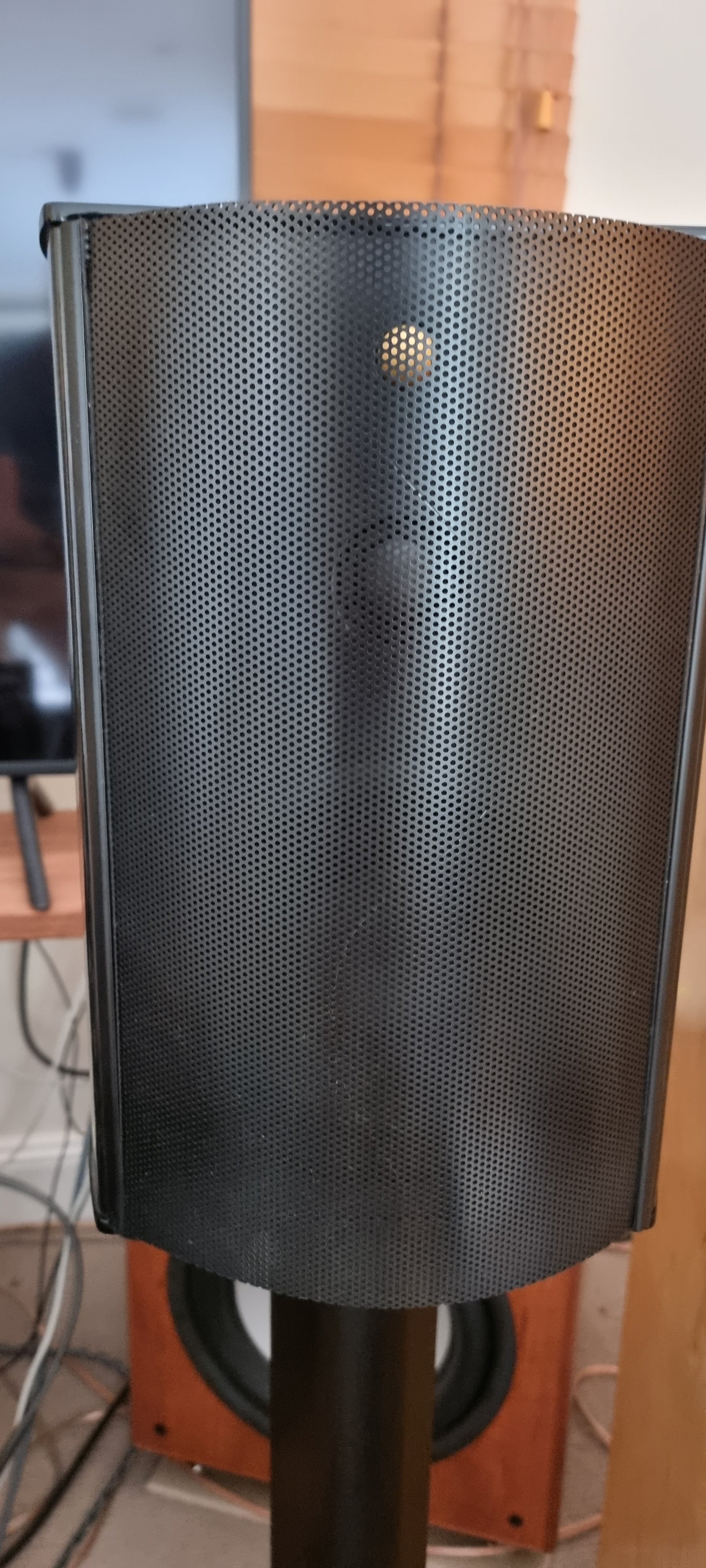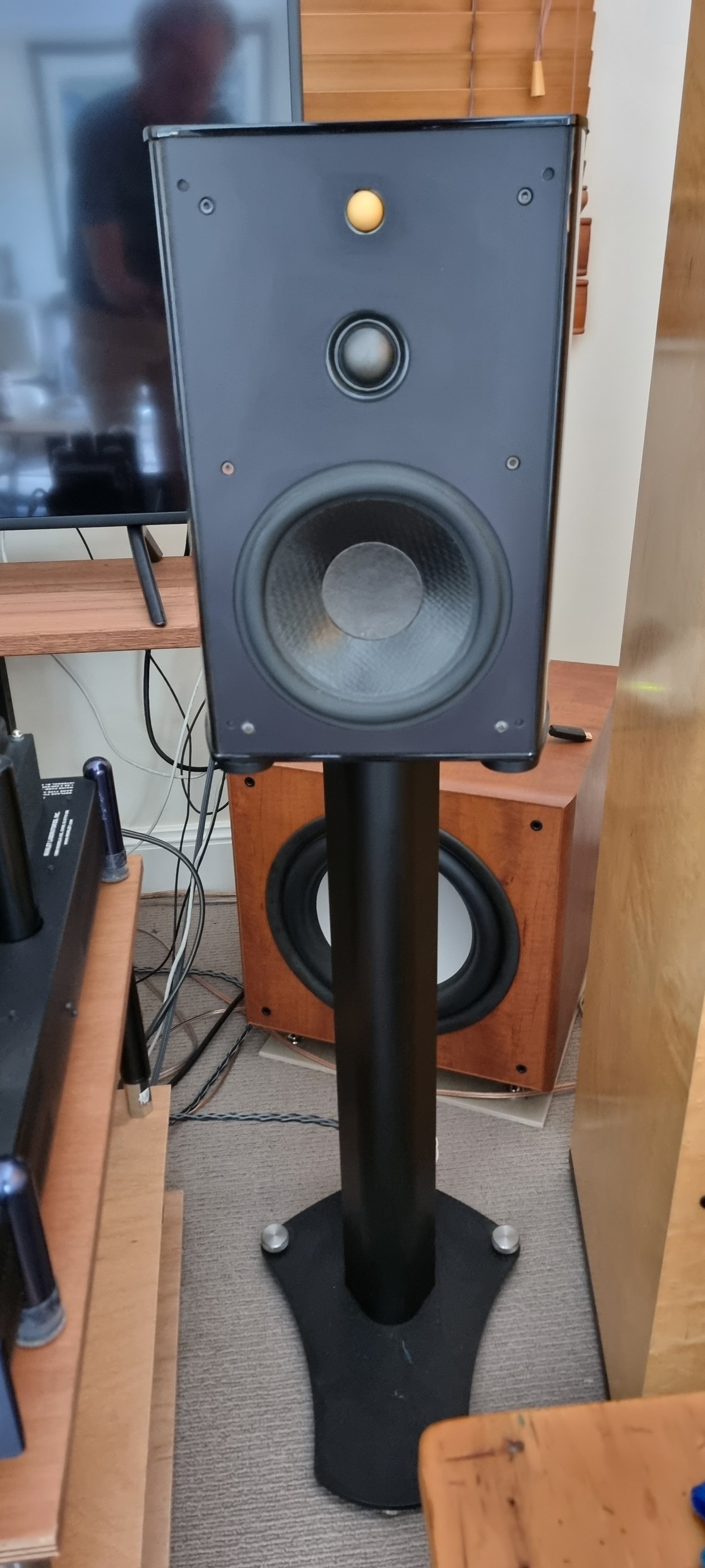 The 2nd speaker is near mint. Both have some slight polish marks on the piano-black top, but minimal. Both come with there removable metal screens, and both have Kimber Kable links.